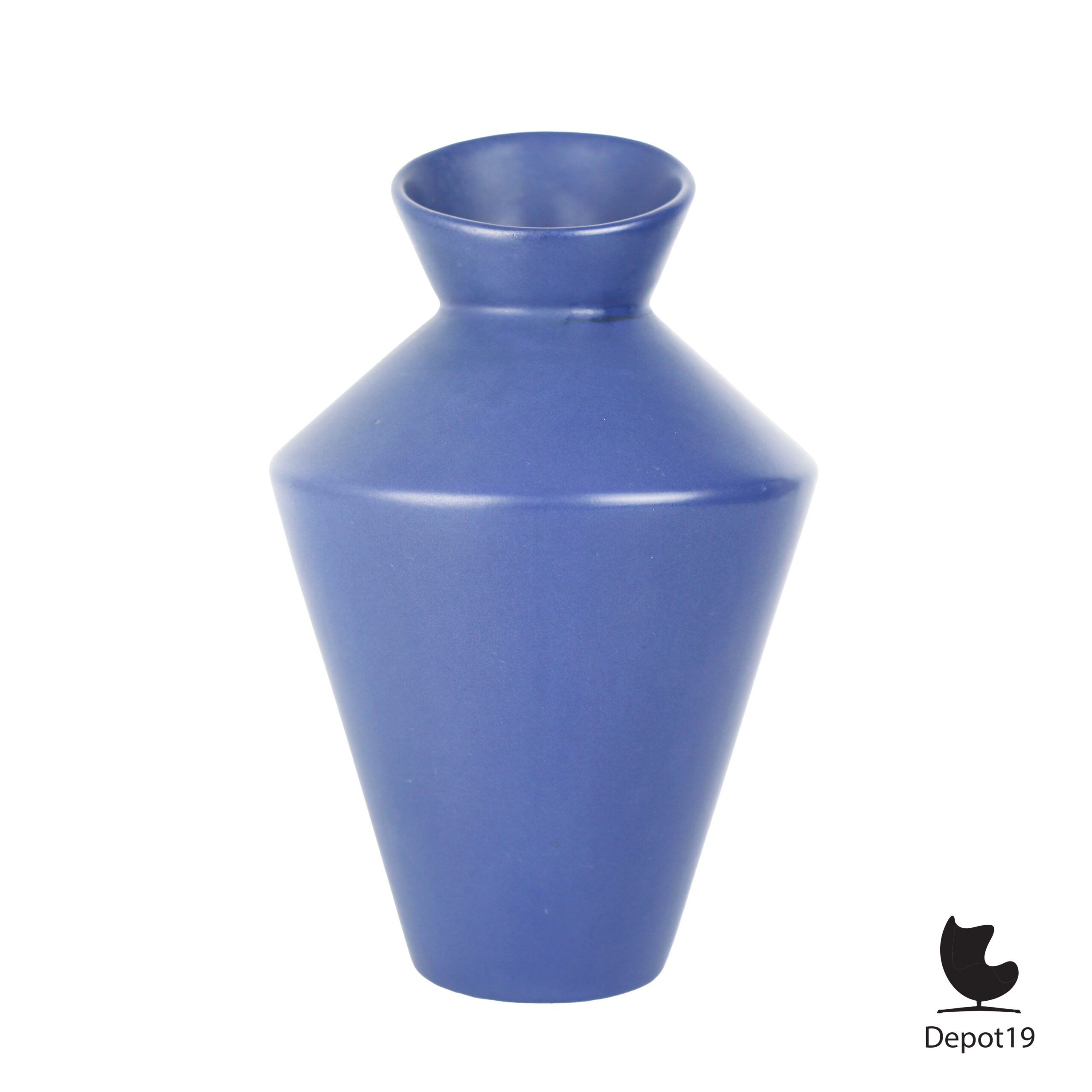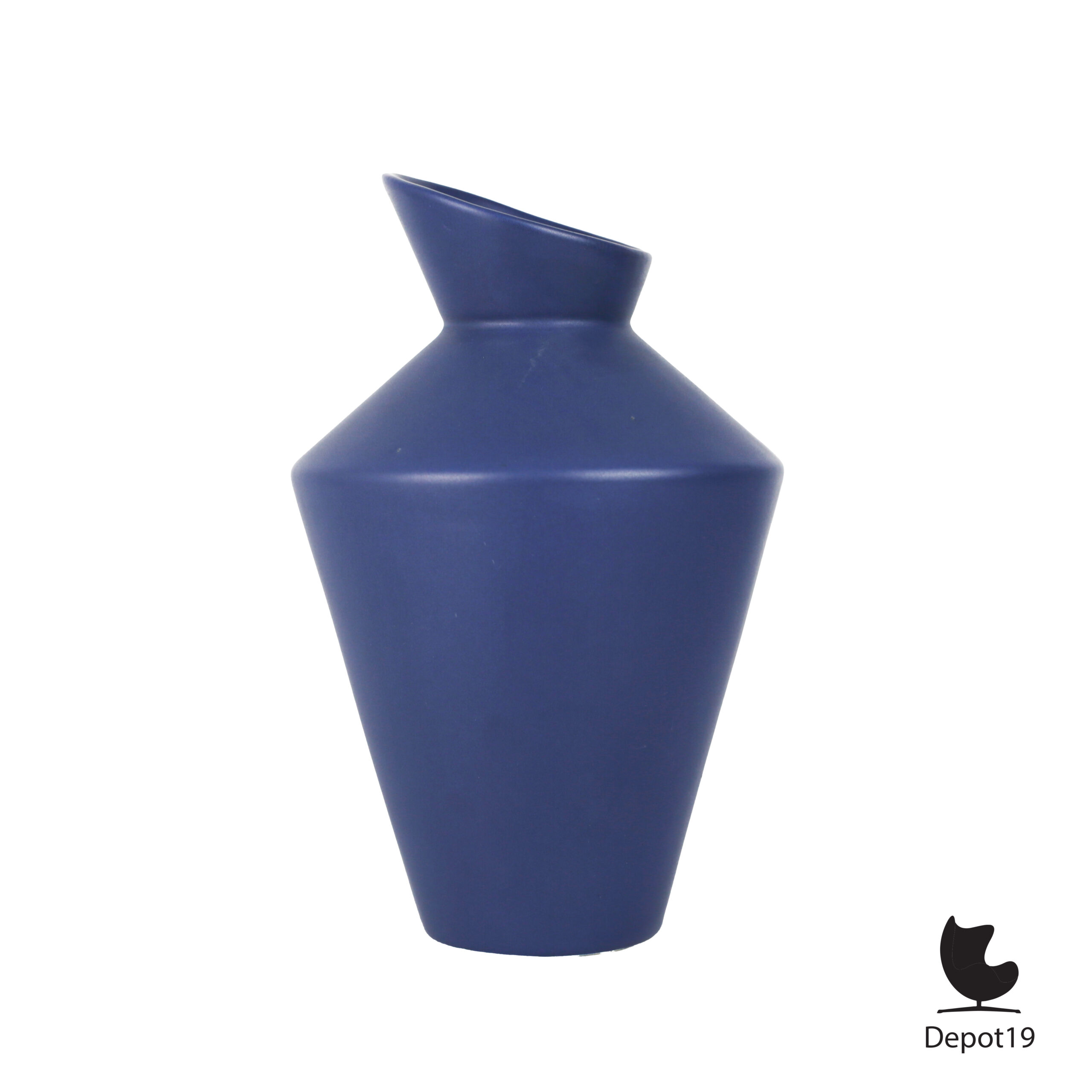 Deze elegante ASA Selection-vaas uit de jaren 80 is een karakteristiek voorbeeld van de post-modernistische keramiek die West-Duitsland destijds voortbracht. De vaas heeft een krachtige, geometrische vorm met een licht gedraaide hals en een mat-zijdeglanzend blauw glazuur dat subtiel het licht vangt.