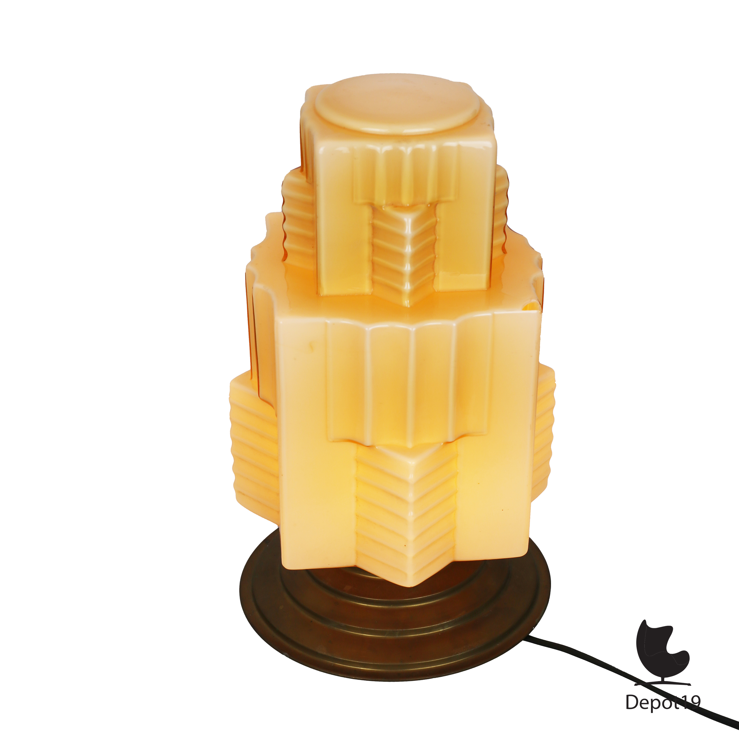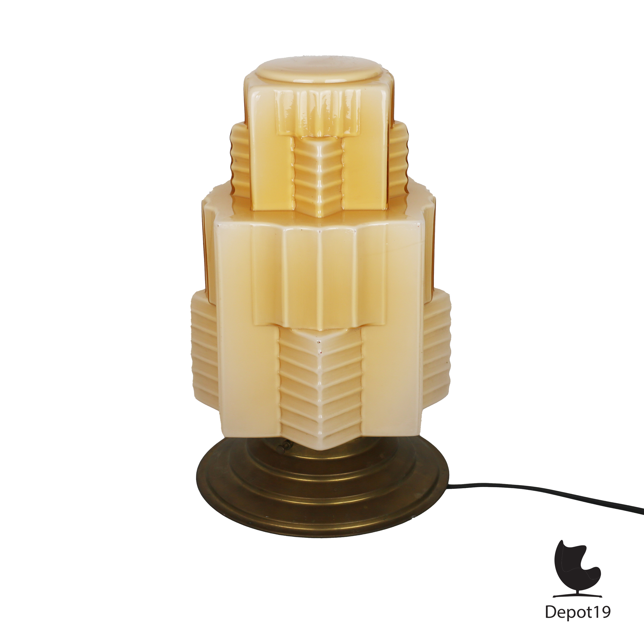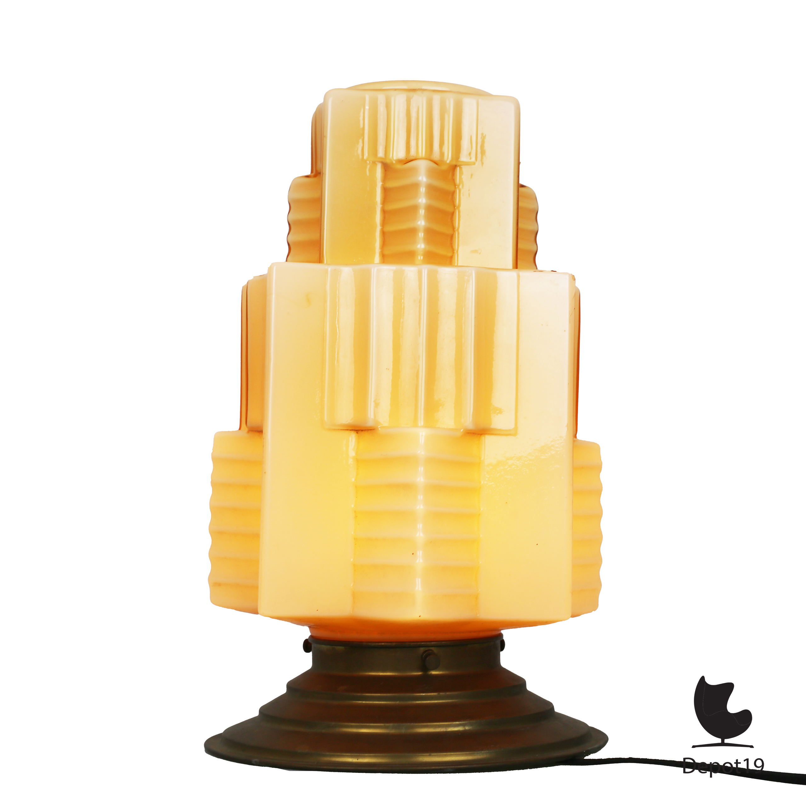 Britse Art Deco skyscraperkap tafellamp amberkleurig persglas ca. 1930