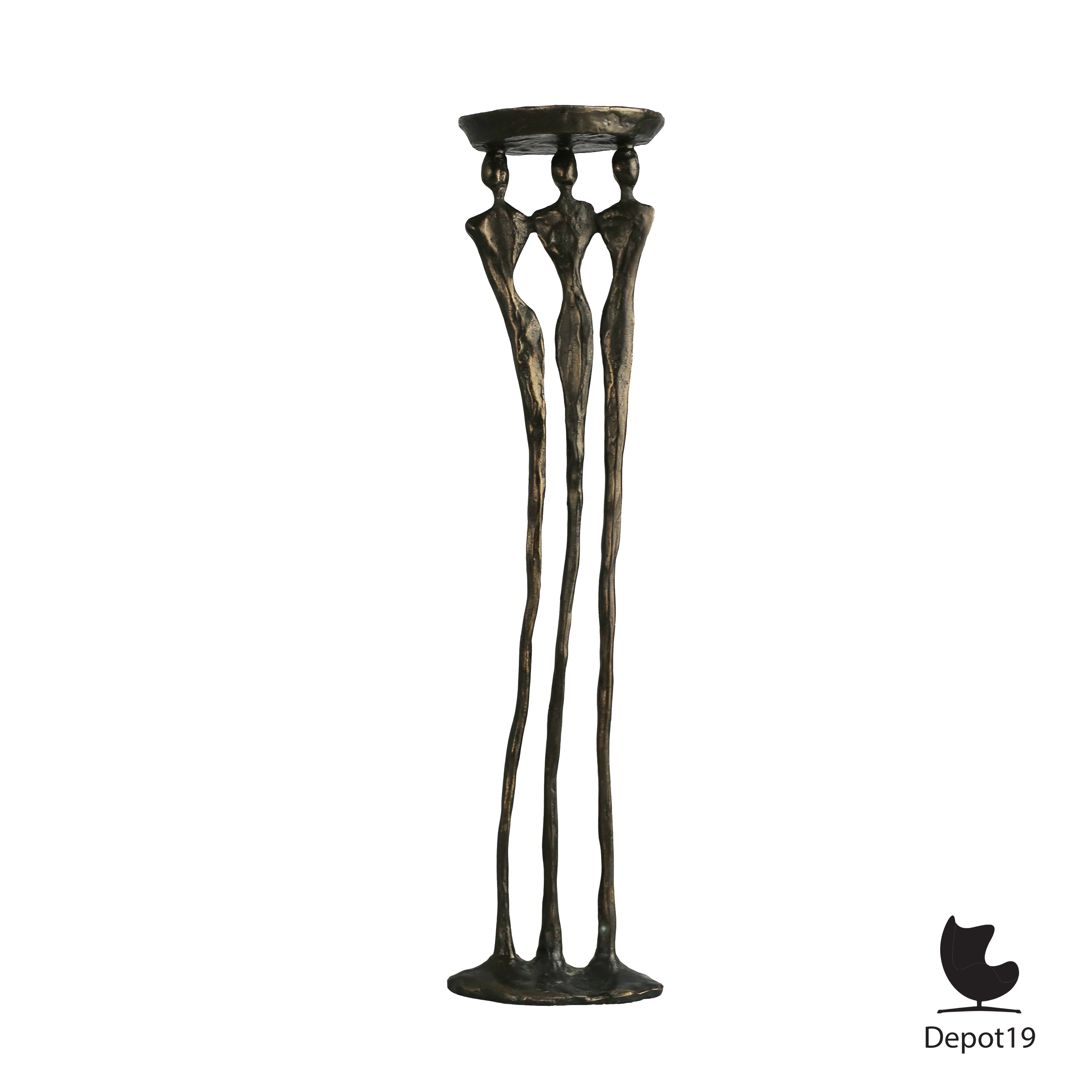 Ambachtelijk gegoten bronzen sculptuur van drie gestileerde vrouwen die samen een schaal dragen. De moderne vormgeving, langgerekte lijnen en warme patina geven het beeld een elegante en tijdloze uitstraling.