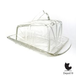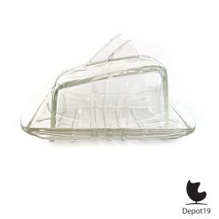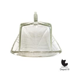 Deze vintage kaasstolp uit de jaren 1930, in stijl toegeschreven aan Andries Dirk Copier voor Leerdam, is een schoolvoorbeeld van Art Deco vormgeving. Het helder persglas, gecombineerd met de strakke geometrische contouren, toont perfect de moderne visie van Copier: zuivere lijnen, functionaliteit en sculpturale elegantie.