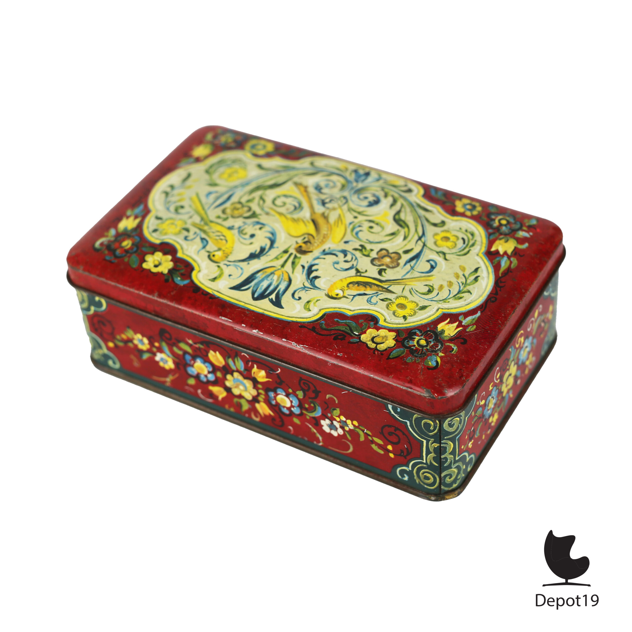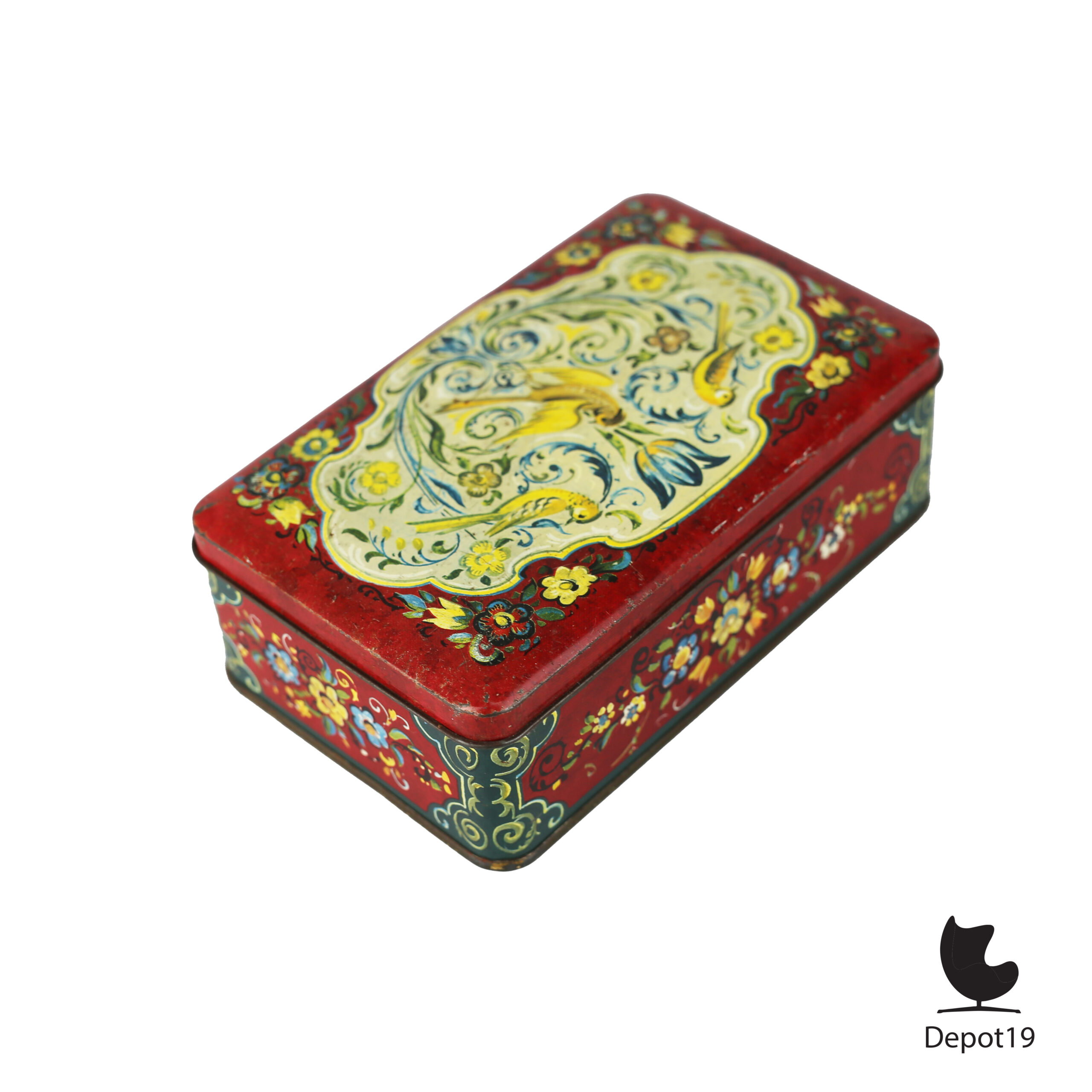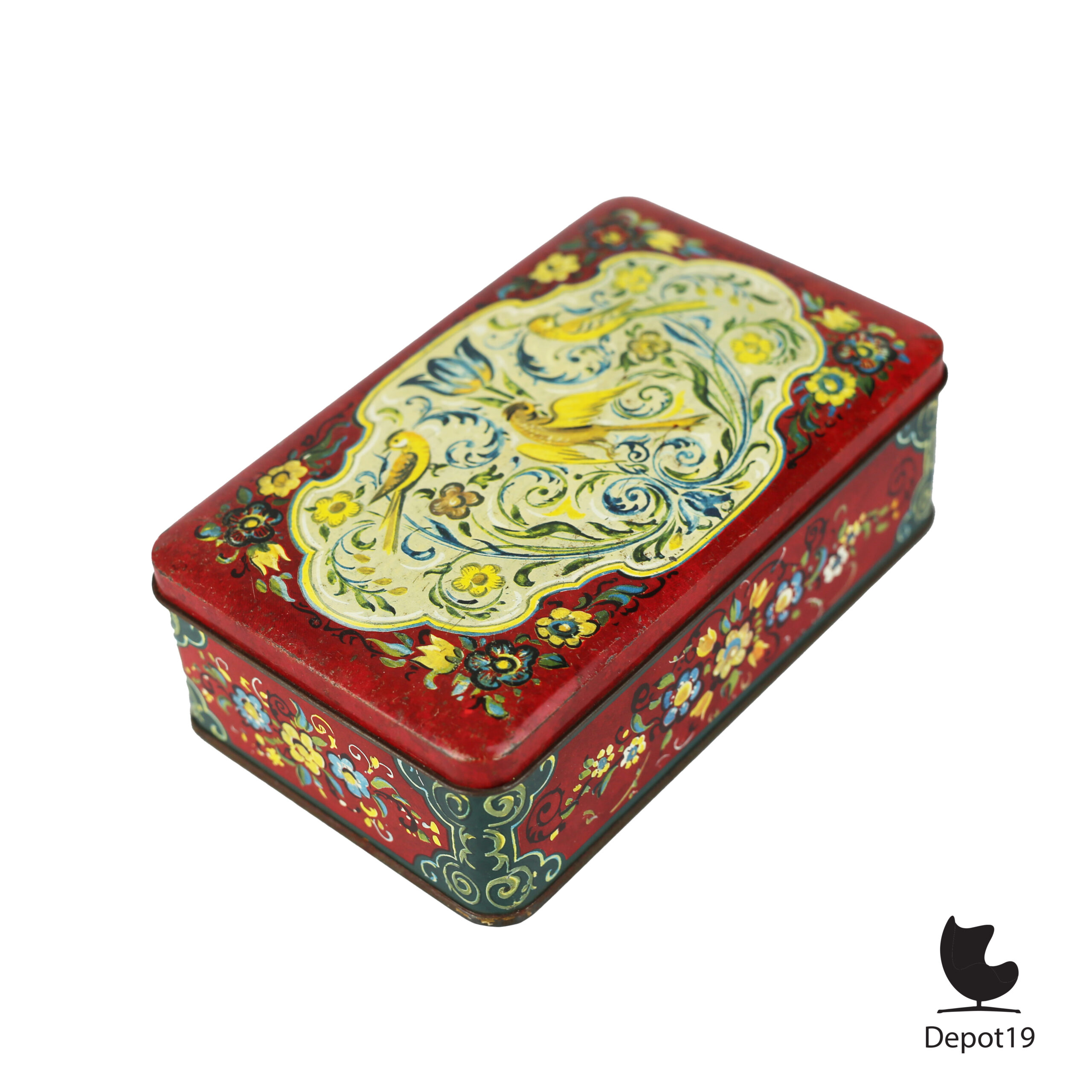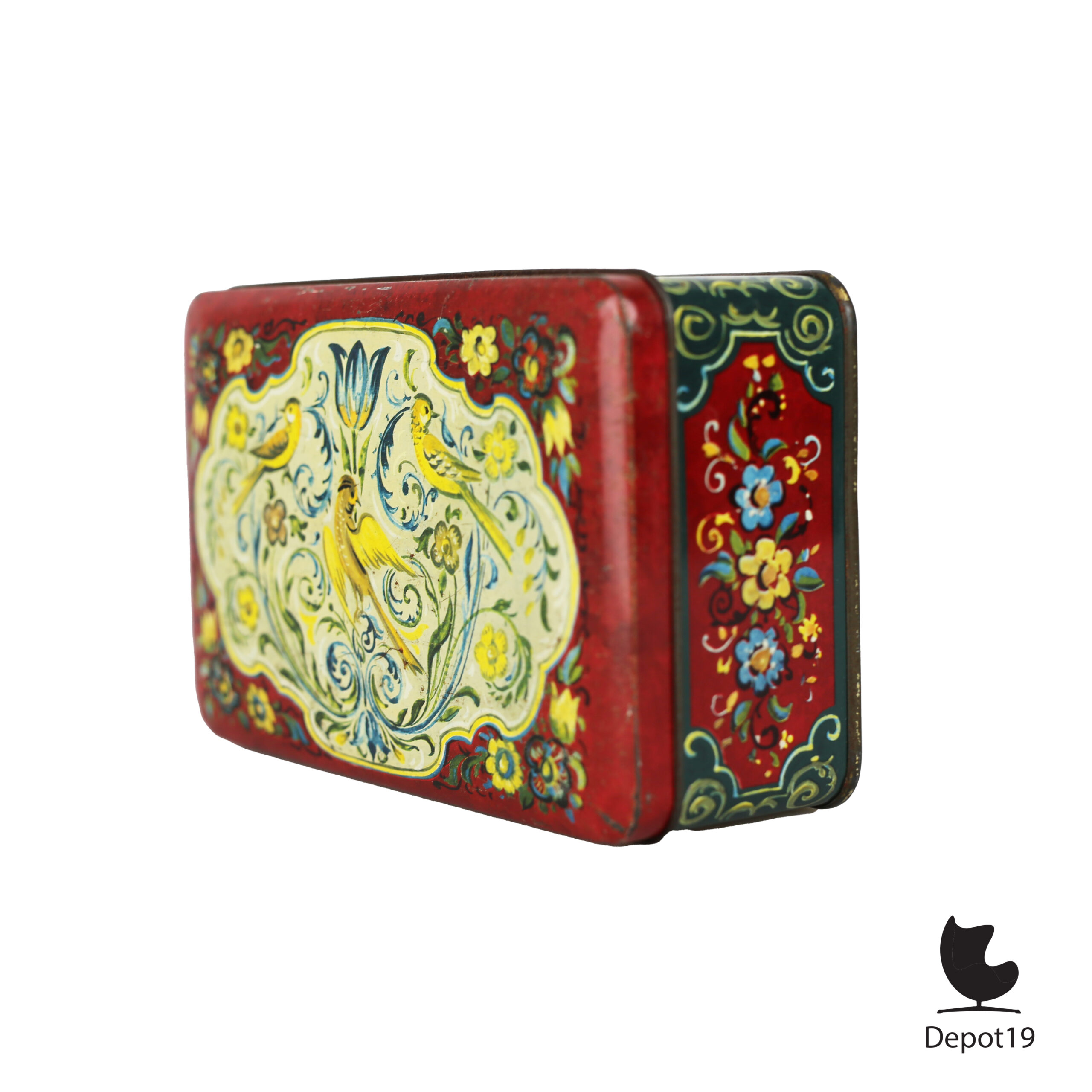 Het blik is uitgevoerd in dieprood met op het deksel een decoratief cartouche-veld waarin twee vogels tussen bloemranken zijn afgebeeld, omgeven door een sierlijke rand in geel, groen en blauw.