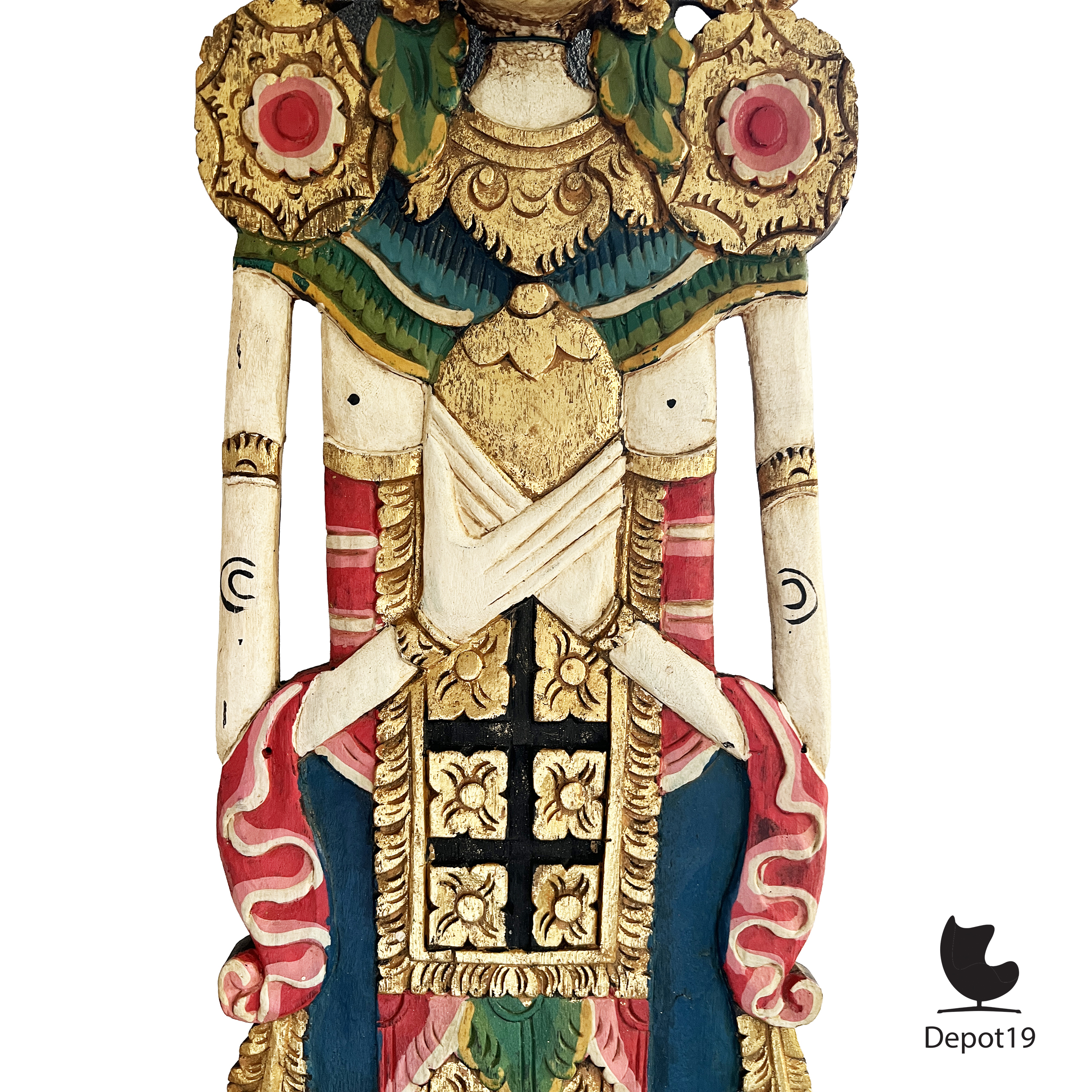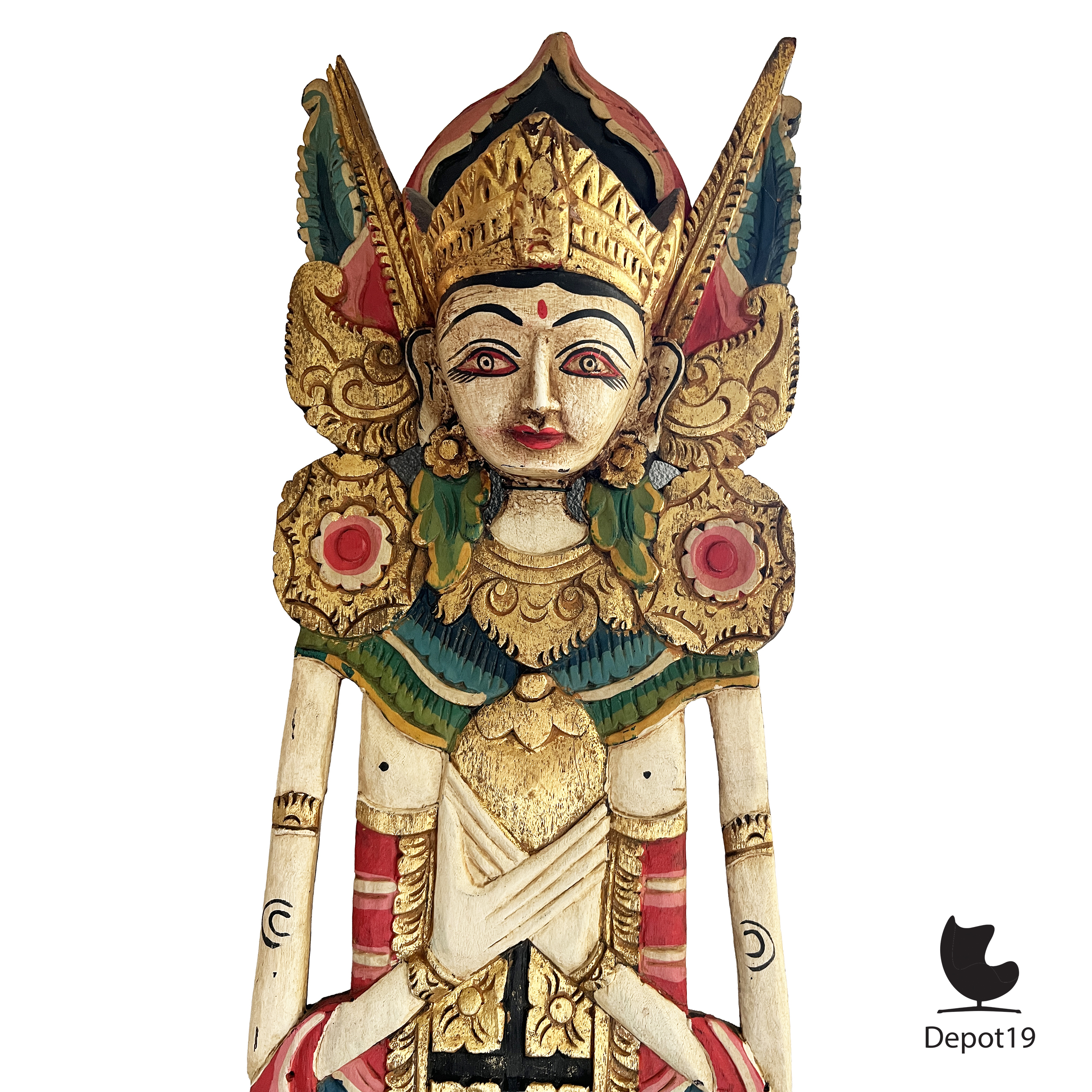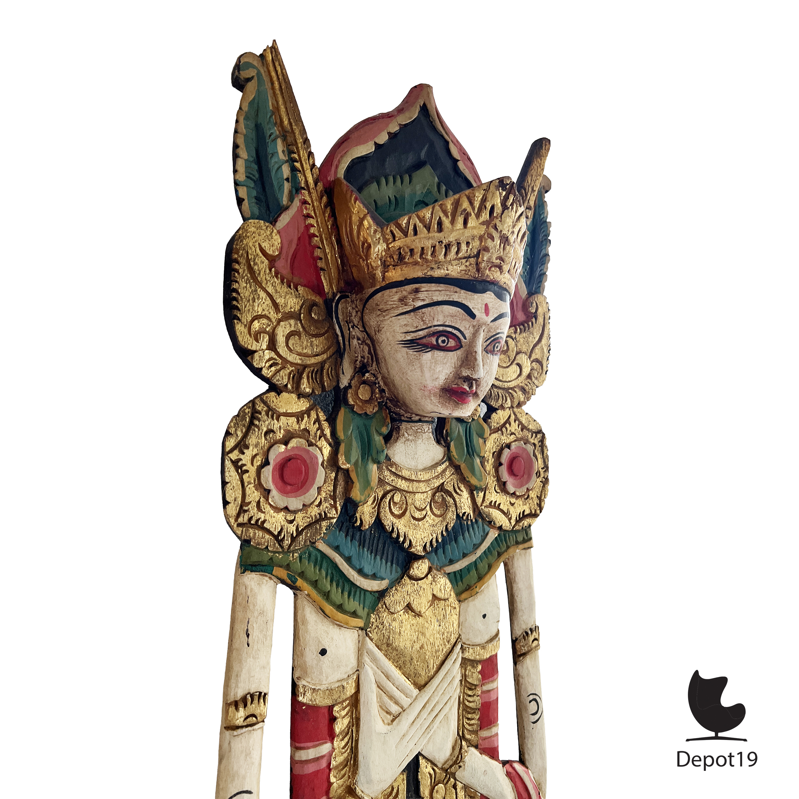 Deze Balinese tempelarca toont een vrouwelijke beschermfiguur in strikte frontale houding, gesneden uit één massief houten paneel en afgewerkt met traditionele polychromie en vergulding. De verfijnde kroon, bladornamentiek en symmetrische borst- en gordelpanelen verwijzen naar de klassieke Balinese tempelesthetiek uit de eerste helft van de twintigste eeuw.