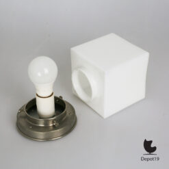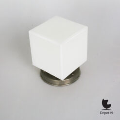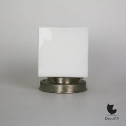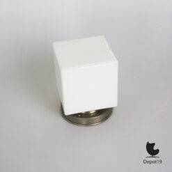 Het ontwerp is opgebouwd rond een kubusvormige lampenkap van opaline glas, dat ook bekendstaat als melkglas. Dit materiaal verspreidt het licht op zachte, diffuse wijze, waardoor het een aangename sfeer creëert zonder te verblinden. De ronde lampekaphouder in vernikkeld metaal vormt een subtiel contrast met de strakke lijnen van het glas, en geeft het ontwerp zijn karakteristieke balans tussen zakelijkheid en verfijning.