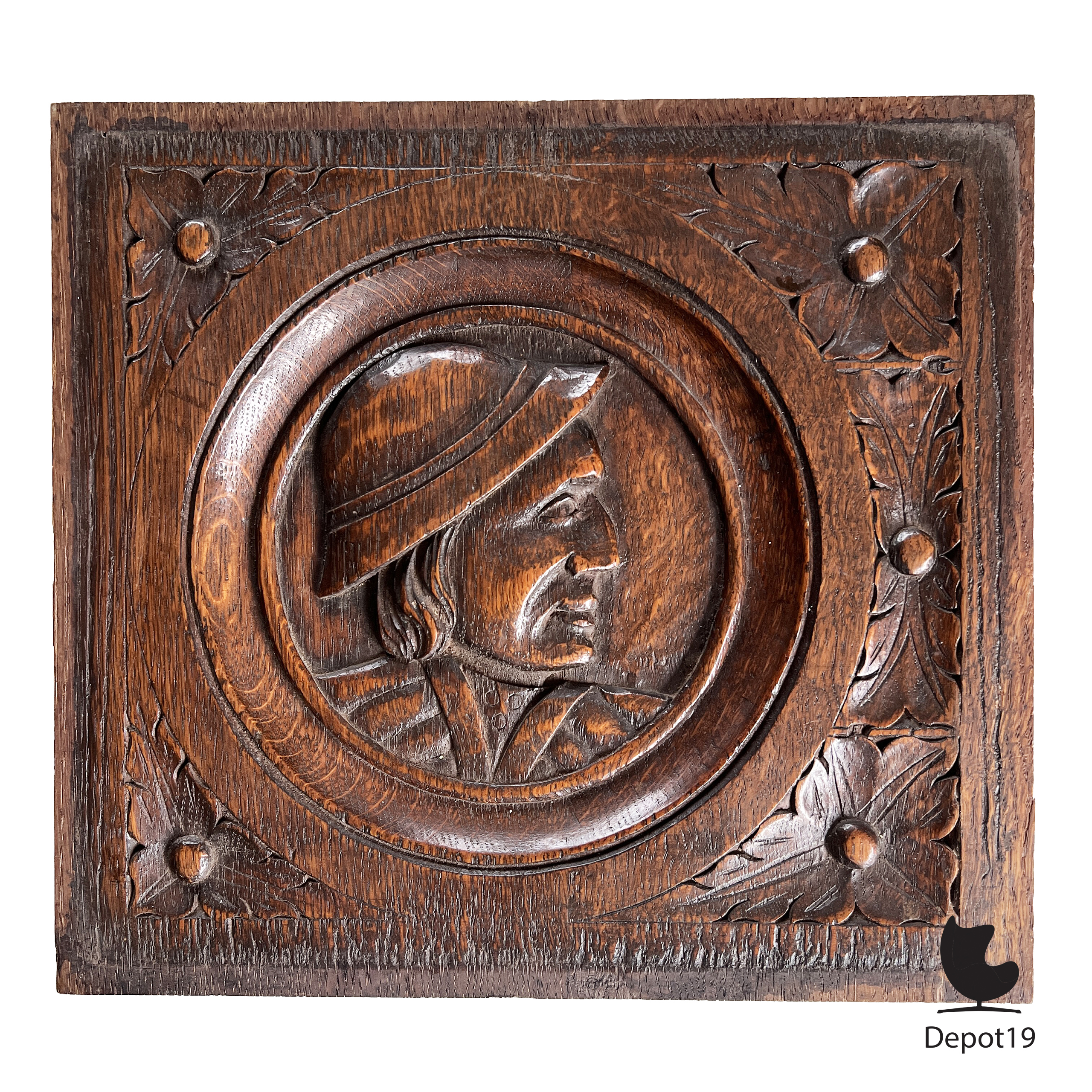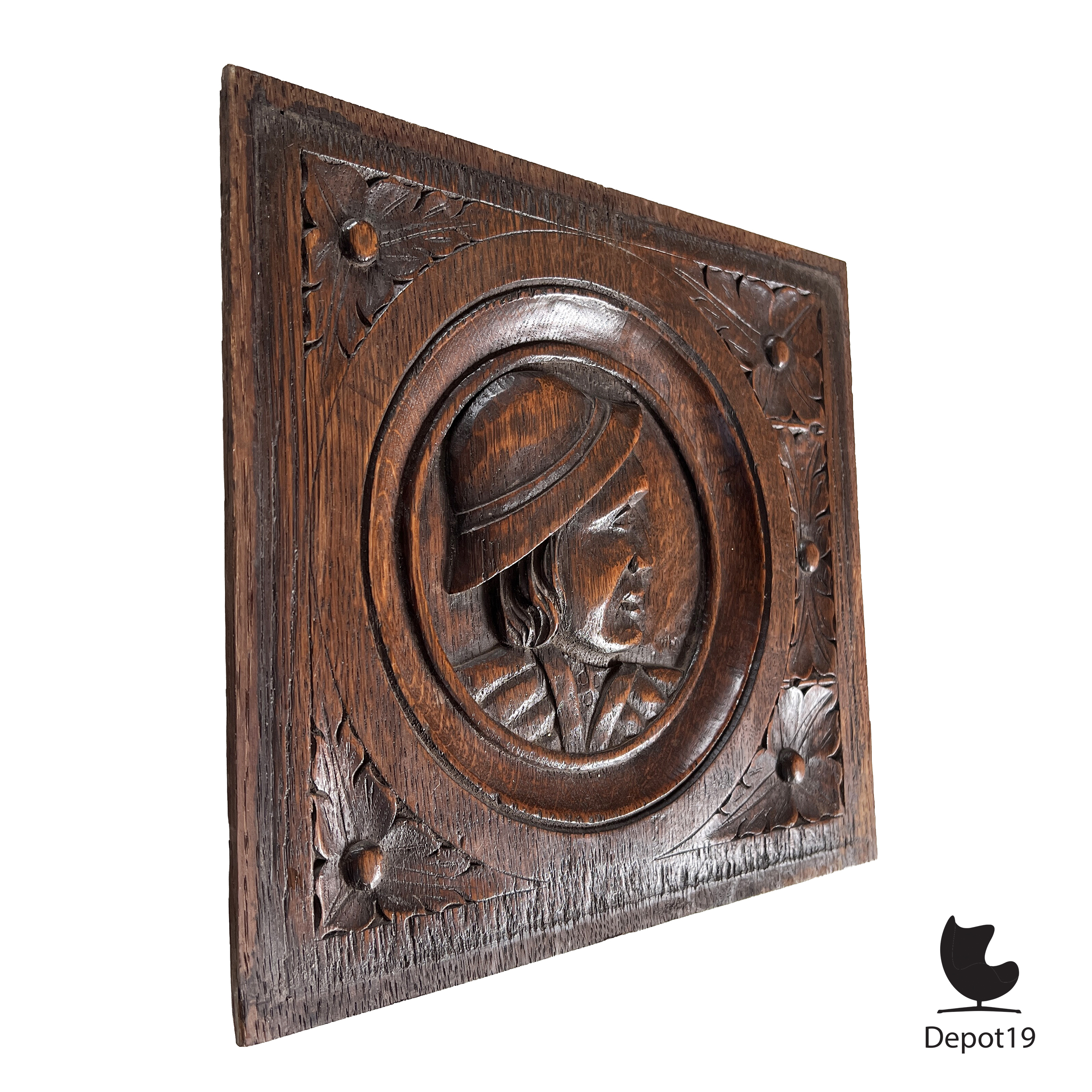 Prachtig Gothic Revival eiken paneel, een portretmedaillon met warme patina en sterke dieptewerking uit ca 1870