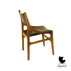 De stoel is uitgevoerd in massief teak, een houtsoort die geliefd blijft om zijn diepte, duurzaamheid en soepel ogende lijnen. De zachte rondingen in de rugleuning versterken het zitcomfort, terwijl de vormgeving de typische Mid-Century balans tussen lichtheid en stevigheid laat zien. Bovendien is de originele kunstleren bekleding nog in goede staat, waardoor het geheel authentiek blijft zonder concessies te doen aan dagelijks gebruik.