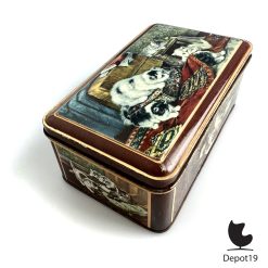Deze antieke koektrommel toont drie prachtige schilderingen van de Nederlandse kunstenares Henriëtte Ronner-Knip (1821–1909), de meest geliefde poezenschilderes van de 19e eeuw. Haar werk, beroemd om de intieme weergave van katten in weelderige salons, werd al tijdens haar leven verzameld door de Europese elite.