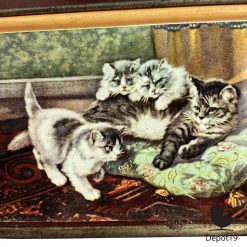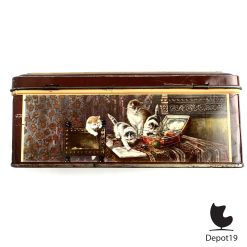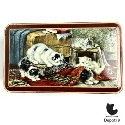 De afbeeldingen op deze vintage koektrommel zijn gebaseerd op drie van haar bekende schilderijen. Op het deksel spelen vier katten met een Perzisch tapijt, terwijl een poes rustig ligt te slapen. De brede zijkanten tonen een moederpoes met drie kittens bij een naaidoos: één katje klautert op een stoel, terwijl de andere twee nieuwsgierig spelen. De smalle zijkanten tonen een moederpoes met haar jongen op een zacht groen kussen — een typisch Ronner-Knip tafereel vol tederheid en elegantie.