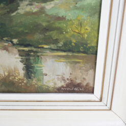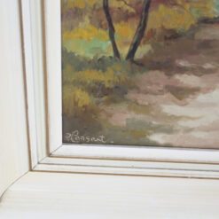 Het schilderij Wolfheze bij Oosterbeek van J.F.A. Lansaat toont een verstild bospad langs een heldere waterpoel, omringd door bomen in volle herfsttooi. De warme oranje- en bruintinten contrasteren met de koelere weerspiegelingen in het water, waardoor een subtiele diepte ontstaat. Lansaat hanteert een precieze penseelstreek en brengt zo de typische kalmte van de Veluwse natuur overtuigend tot leven.