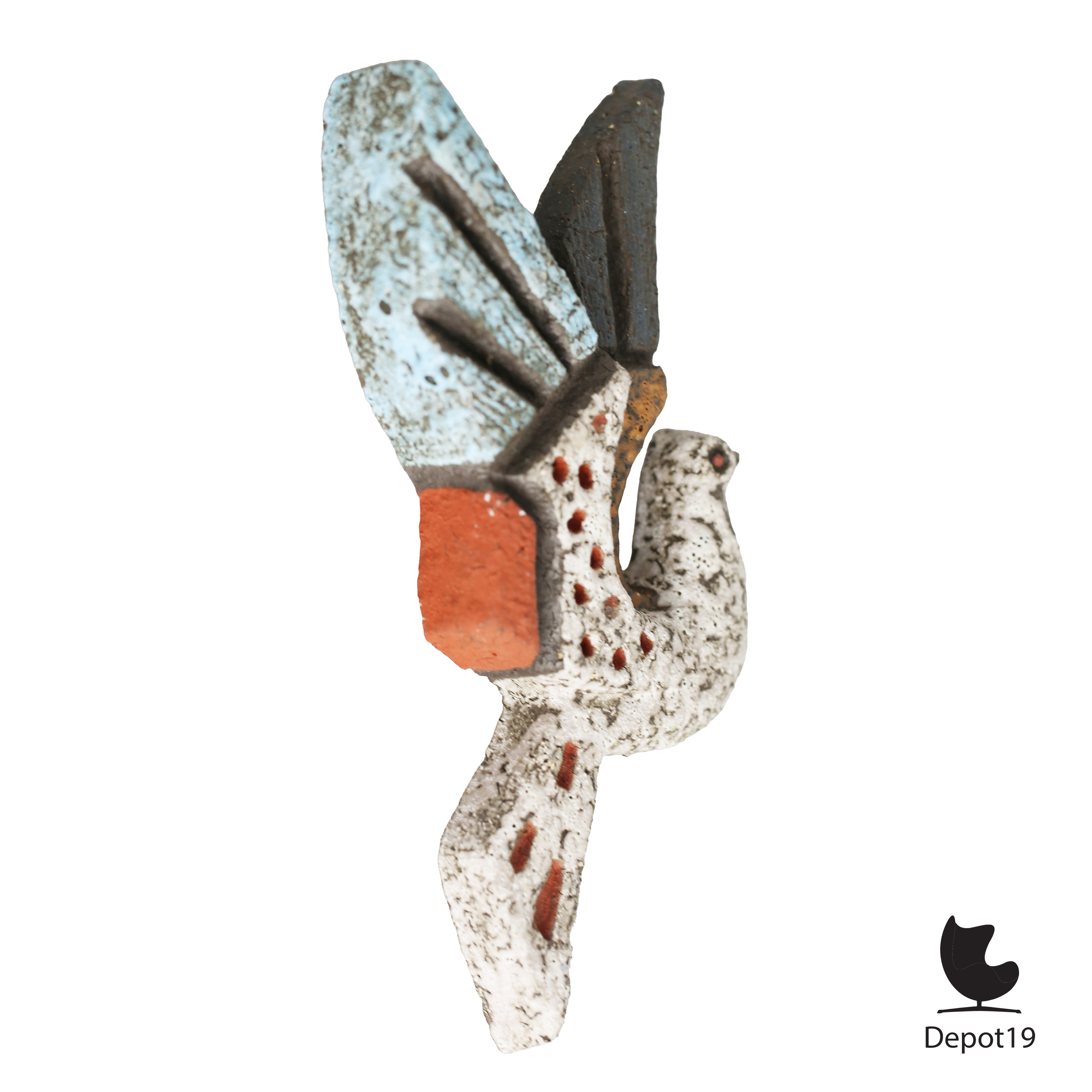 Dit keramische wandobject van Joop Puntman toont een gestileerde vogelvorm met een karakteristieke combinatie van textuur, kleur en ritme. De matte lava-structuur is afgewerkt met turquoise, zwart, rood en natuurlijke aardetinten, waardoor het object zowel speels als sculpturaal oogt. Hierdoor ontstaat een herkenbare signatuur die direct verwijst naar Puntmans werk voor AMHA Holland.