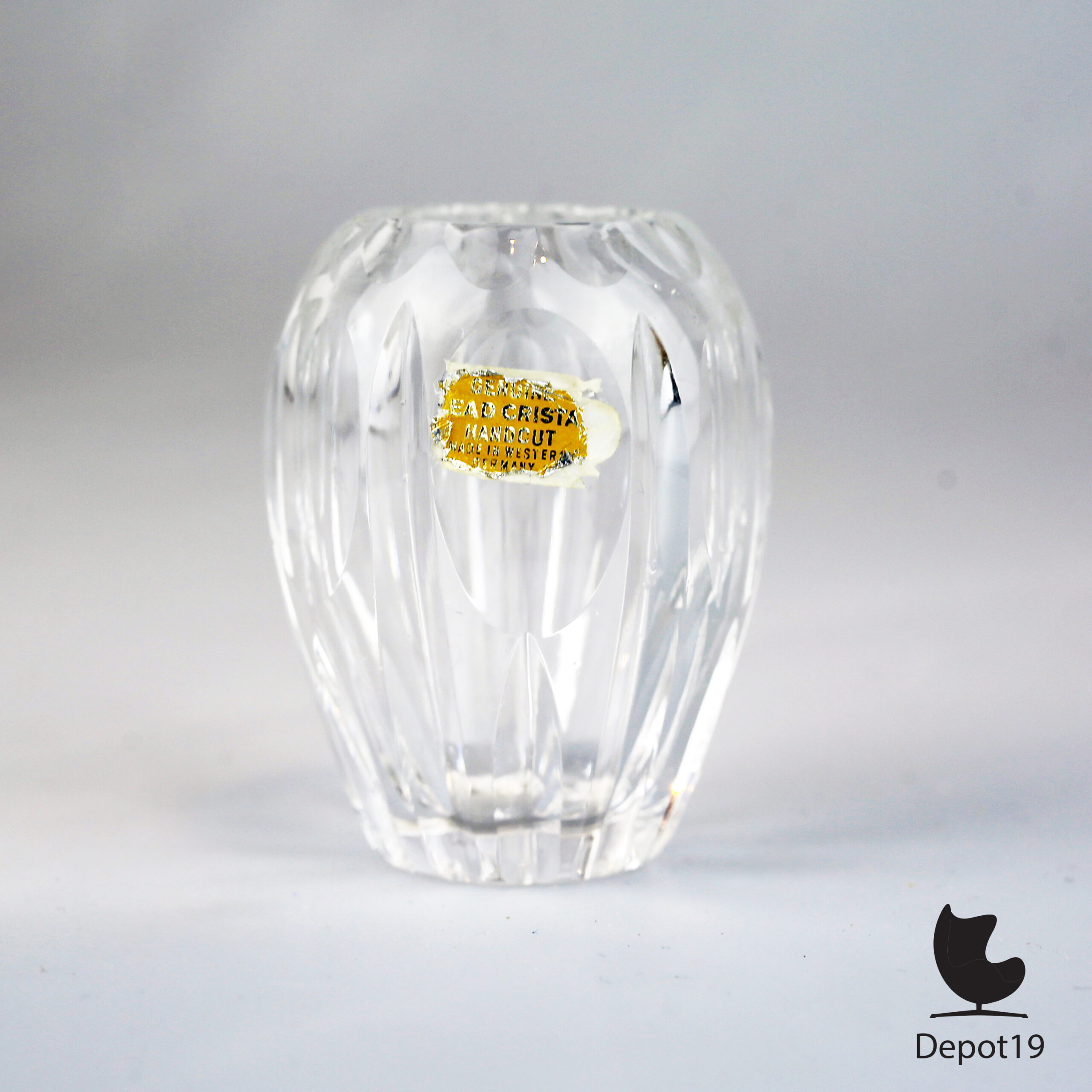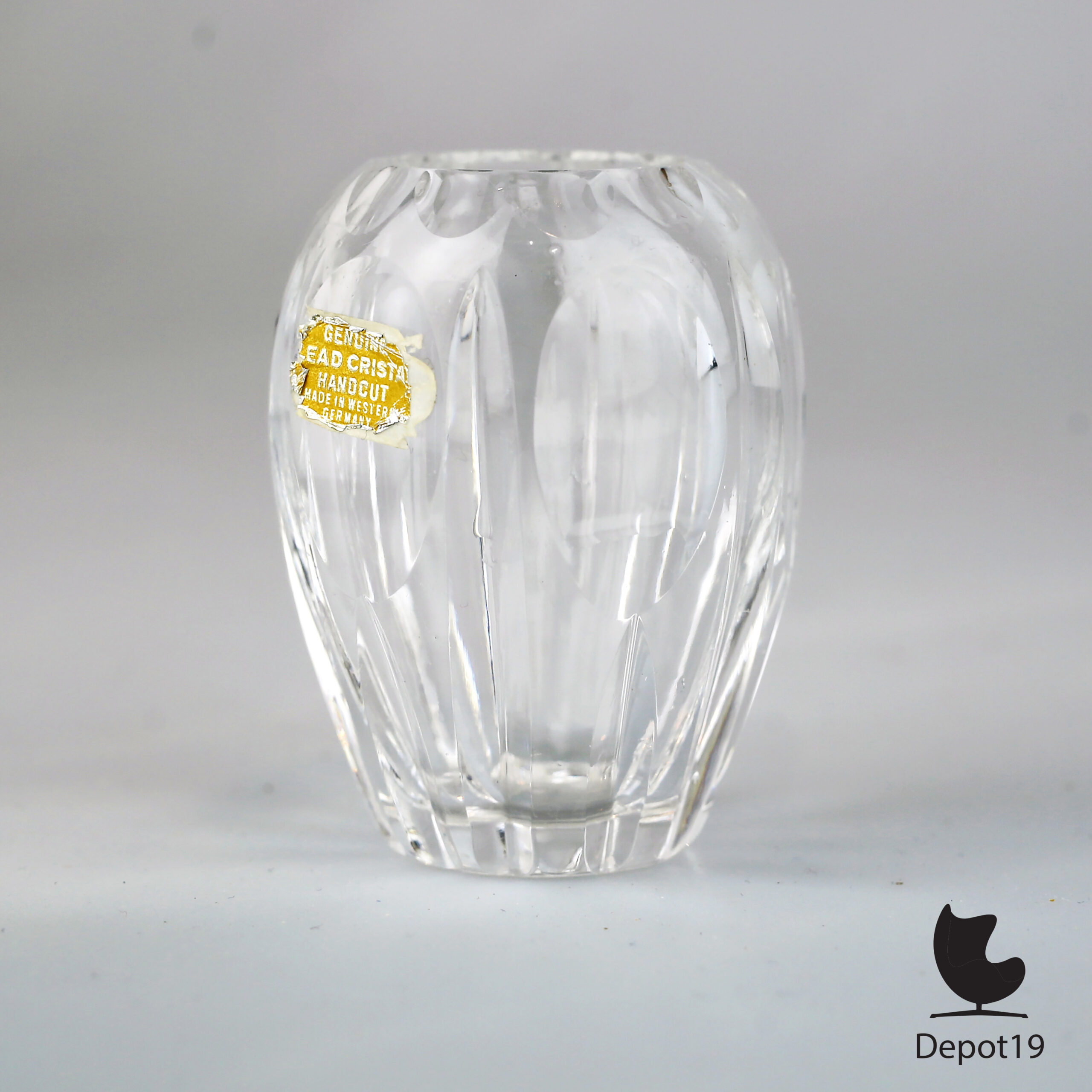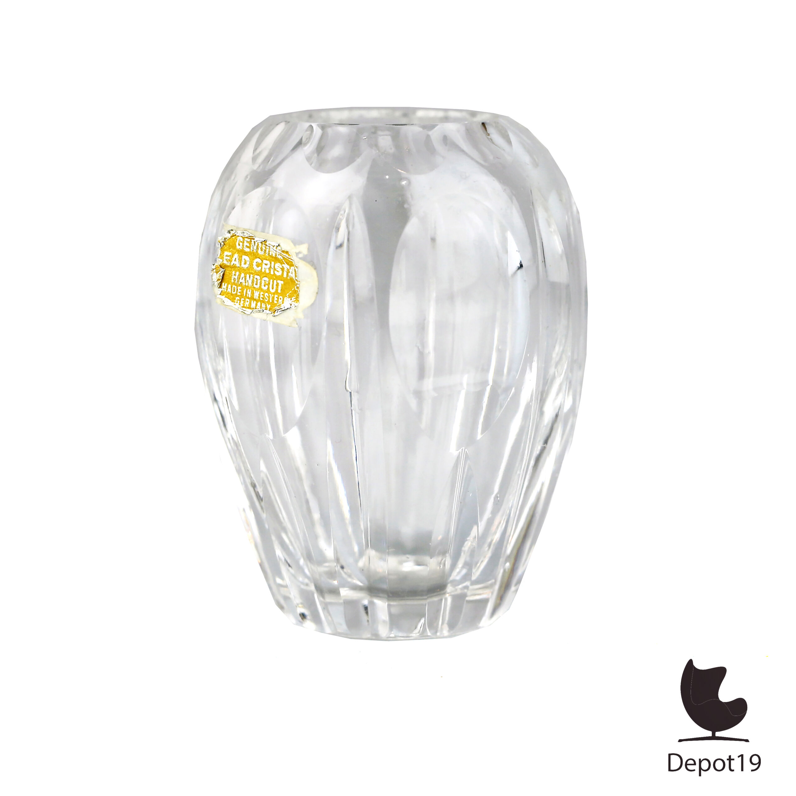In de jaren ’50 en ’60 bouwde West-Duitsland een sterke reputatie op in de productie van hoogwaardig loodkristal. Grote merken zoals Nachtmann en Hofbauer gebruikten eigen merklabels, terwijl kleinere glasfabrieken vaak generieke etiketten als dit toepasten. Daarom is dit vaasje niet met zekerheid aan één specifieke fabrikant toe te schrijven. Toch vertegenwoordigt het een traditie van vakmanschap waarin helderheid, gewicht en handgeslepen facetten centraal staan.