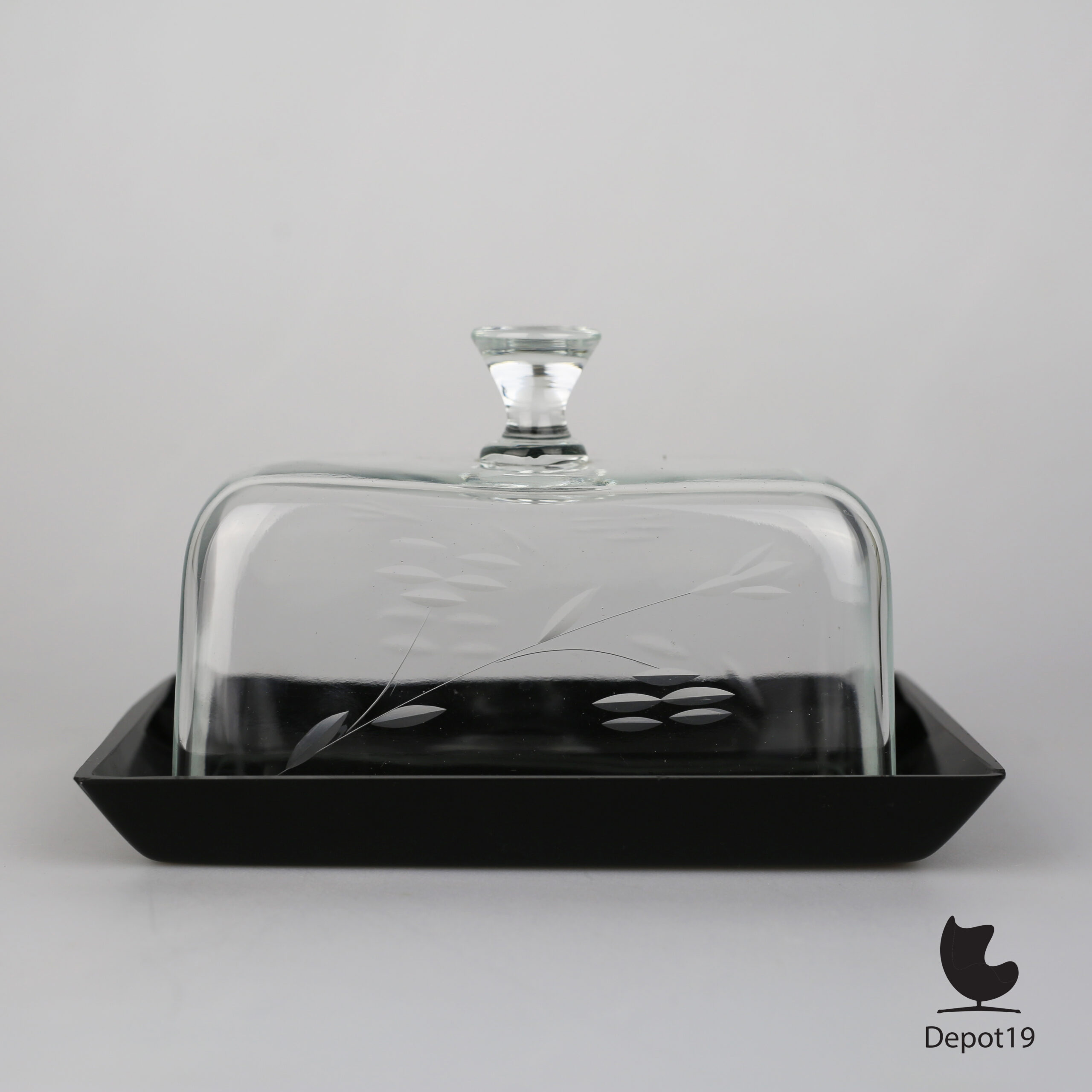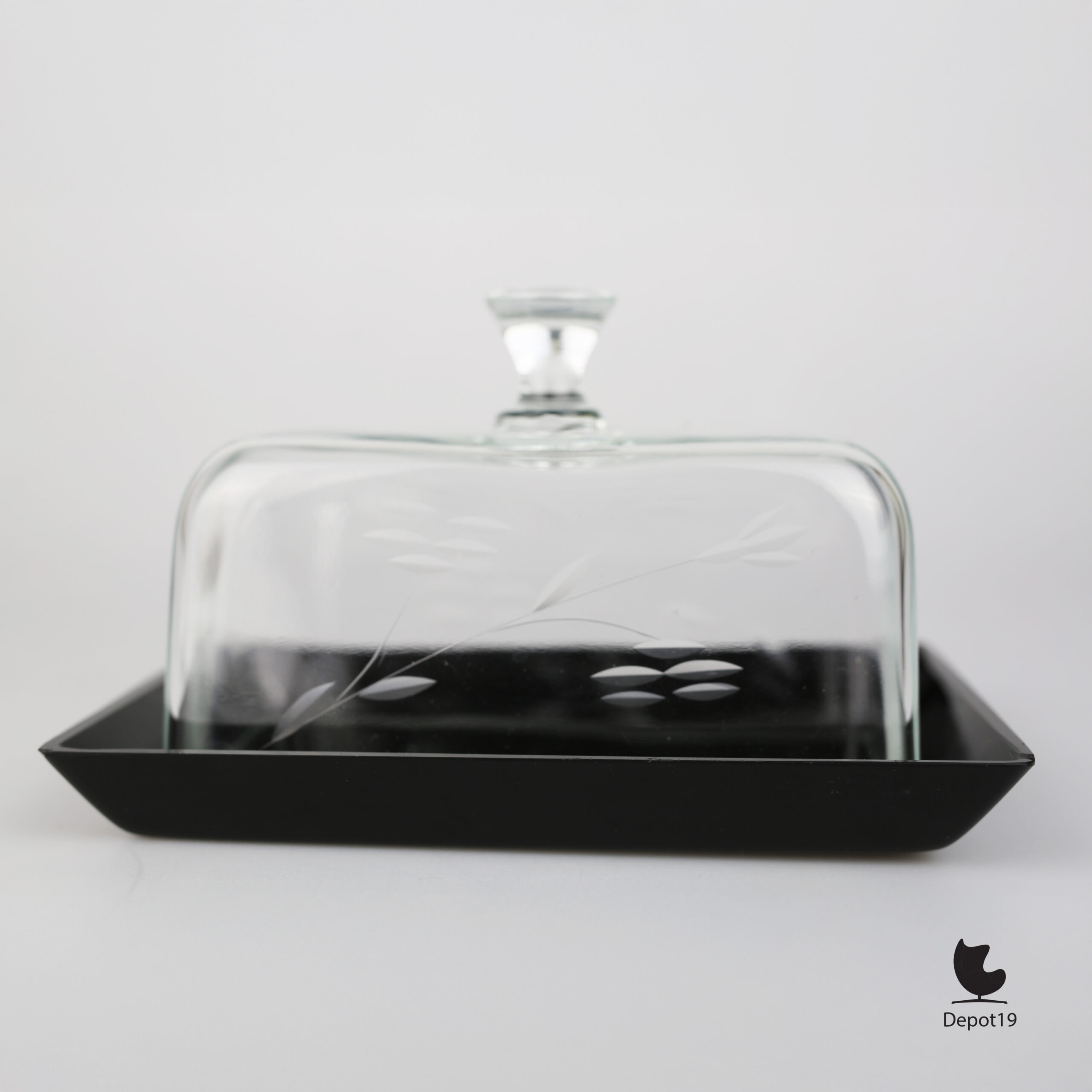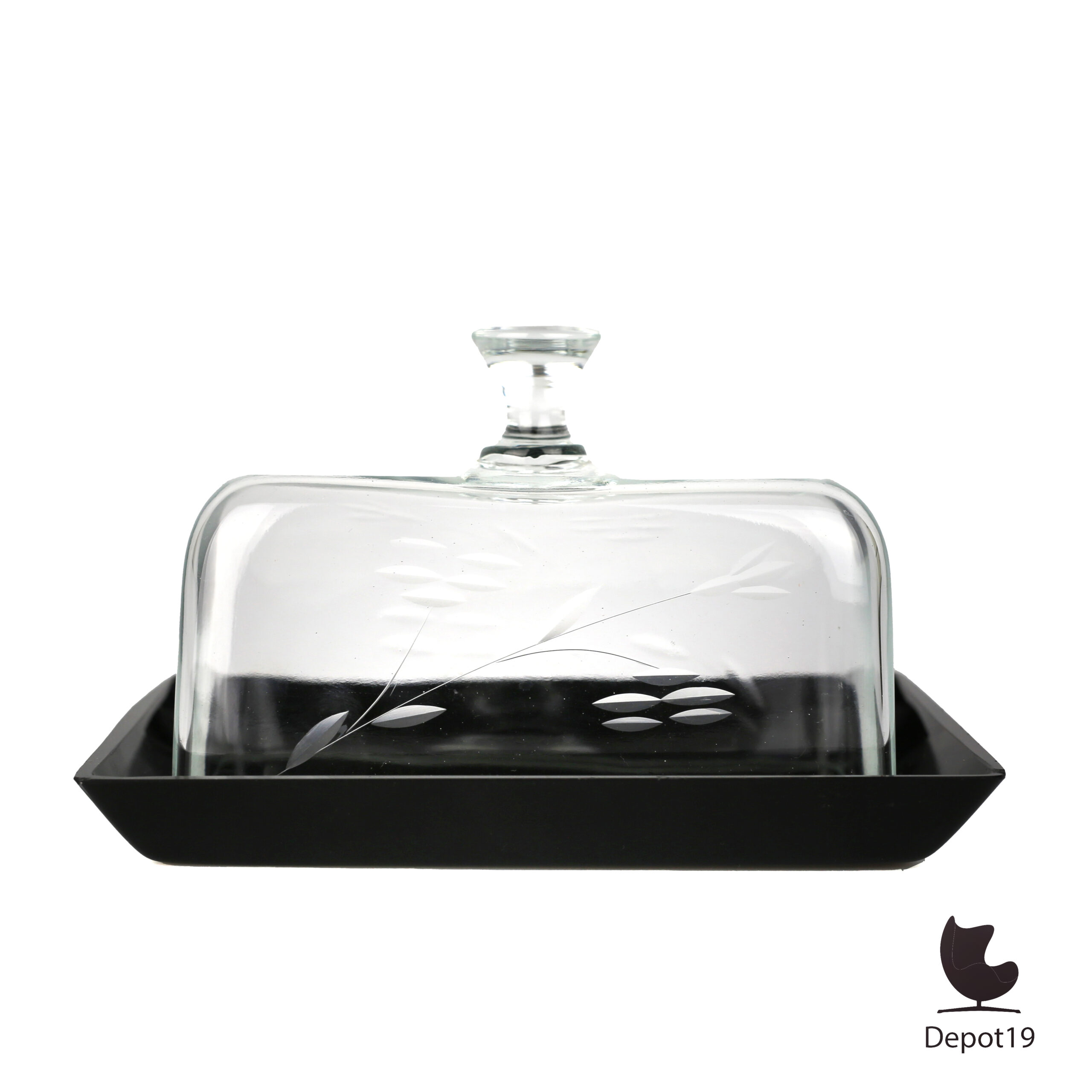 Elegante glazen kaasstolp met handgegraveerd bloem- en bladmotief op de kap en een zeldzame zwarte glazen bodem.
