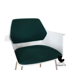 De Wilkhahn 240-5, ontworpen in 1967 door Georg Leowald, toont hoe elegant functioneel design kan zijn wanneer vorm en comfort elkaar versterken. De stoel heeft een glasvezel kuip die licht en stevig aanvoelt, terwijl de beklede rugleuning en zitting een warme, zachte zitervaring geven. Daardoor ontstaat een overtuigende balans tussen modern materiaalgebruik en aangenaam comfort.