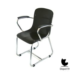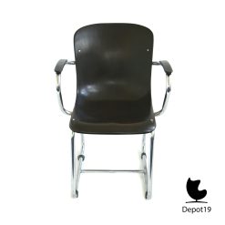 Het frame is opgebouwd uit elegant gebogen stalen buizen, waarvan de uiteinden dichtgelast zijn — een kenmerk dat duidt op pre-oorlogse productie. De stoel is voorzien van donkere bakelieten armleggers en een houtfineer zitschelp, ontworpen voor comfort en eenvoud. Deze combinatie van industriële materialen en ergonomische vormgeving weerspiegelt het vooruitstrevende karakter van de Nederlandse meubelindustrie in die periode.