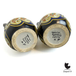 Deze twee Gelria Arnhem vazen uit de periode 1926–1930 tonen het verfijnde vakmanschap van de Plateelbakkerij Gelria in Arnhem. De fabriek, opgericht door Klaas Vet, stond bekend om haar decoratieve aardewerk dat de Nederlandse keramiekkunst internationaal op de kaart zette.