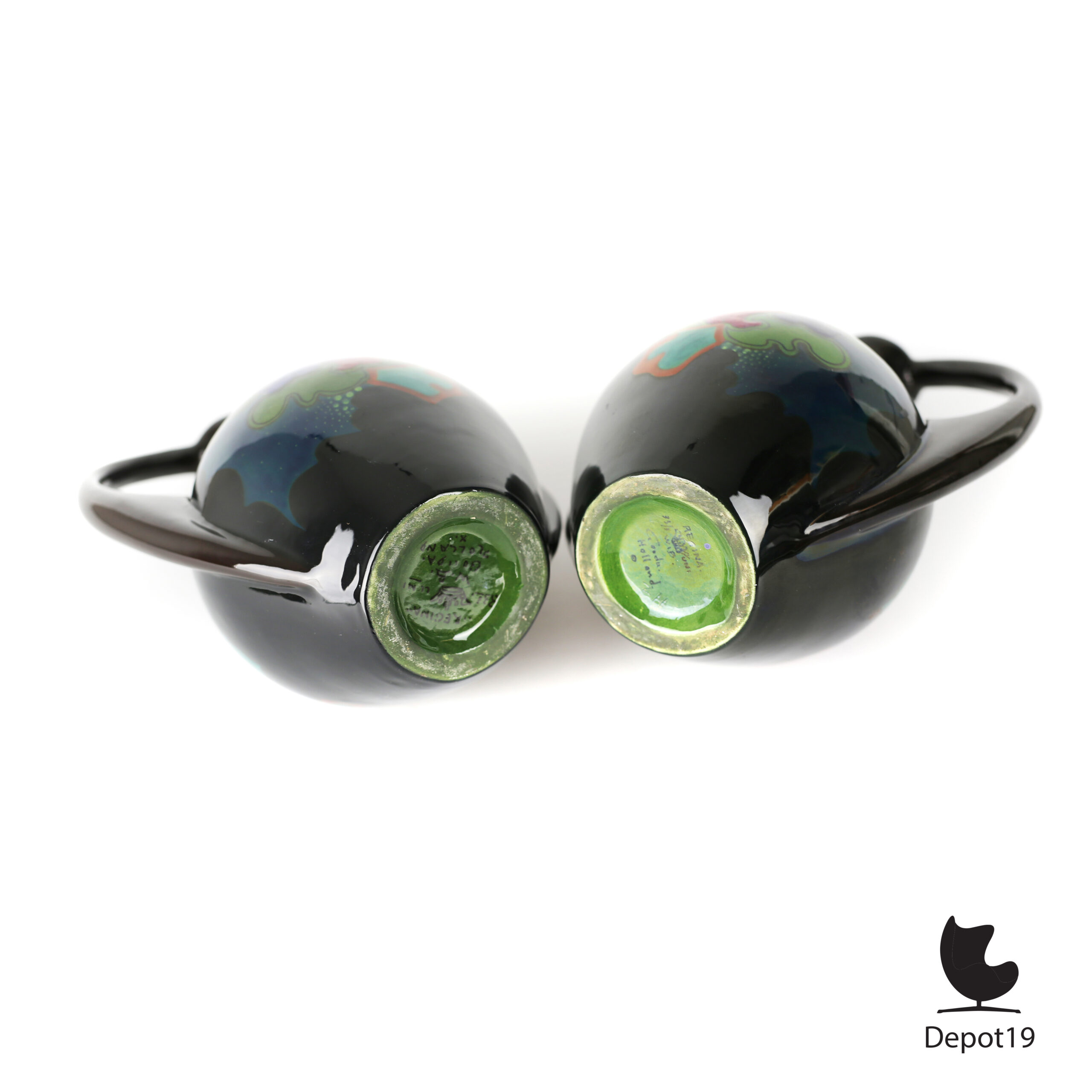 Beide exemplaren zijn aan de onderzijde gemerkt Regina 33/3 Uni Gouda Holland, voorzien van de schildersinitialen W.B. en in de klei gekrast ZH, vermoedelijk de vormer of ovensmid.