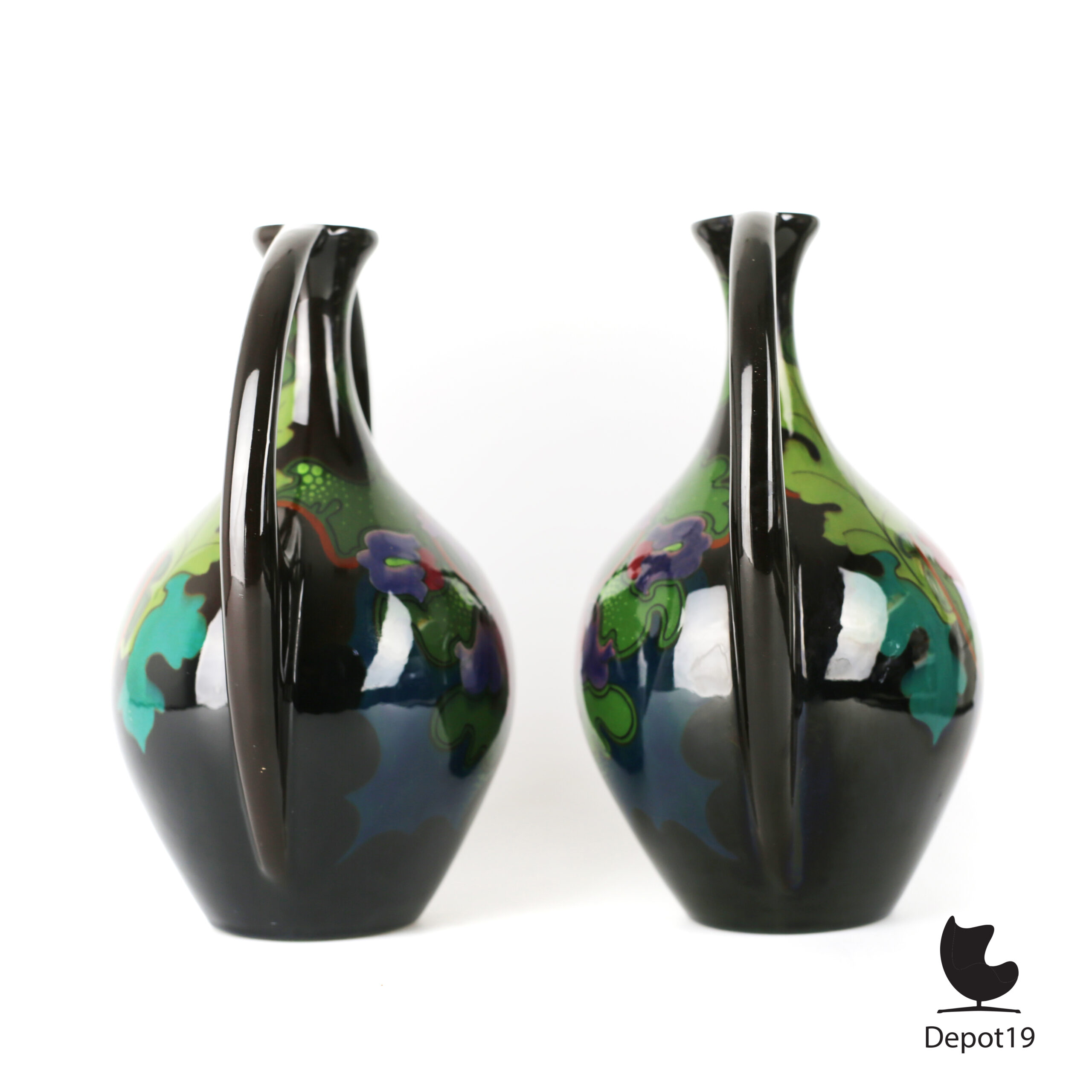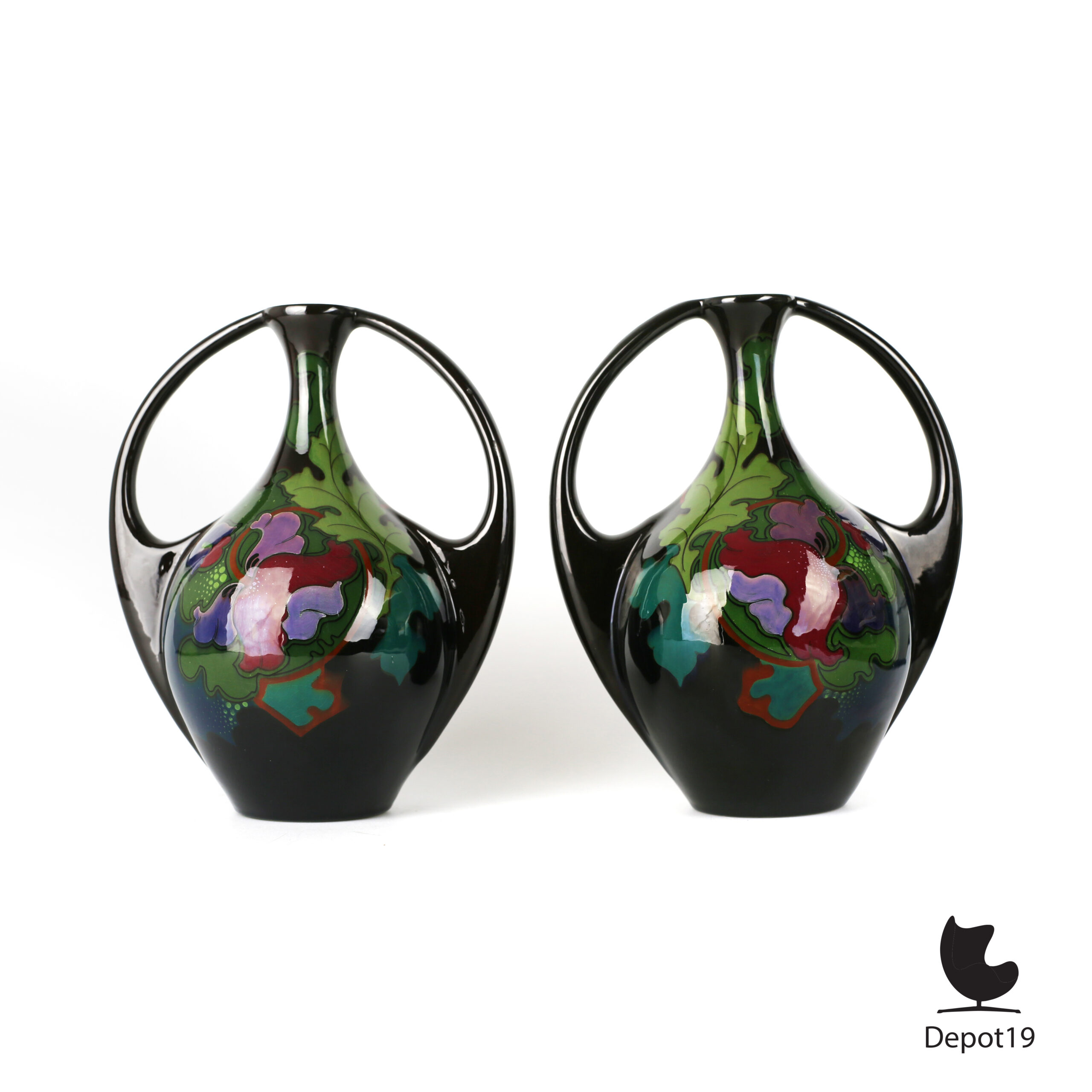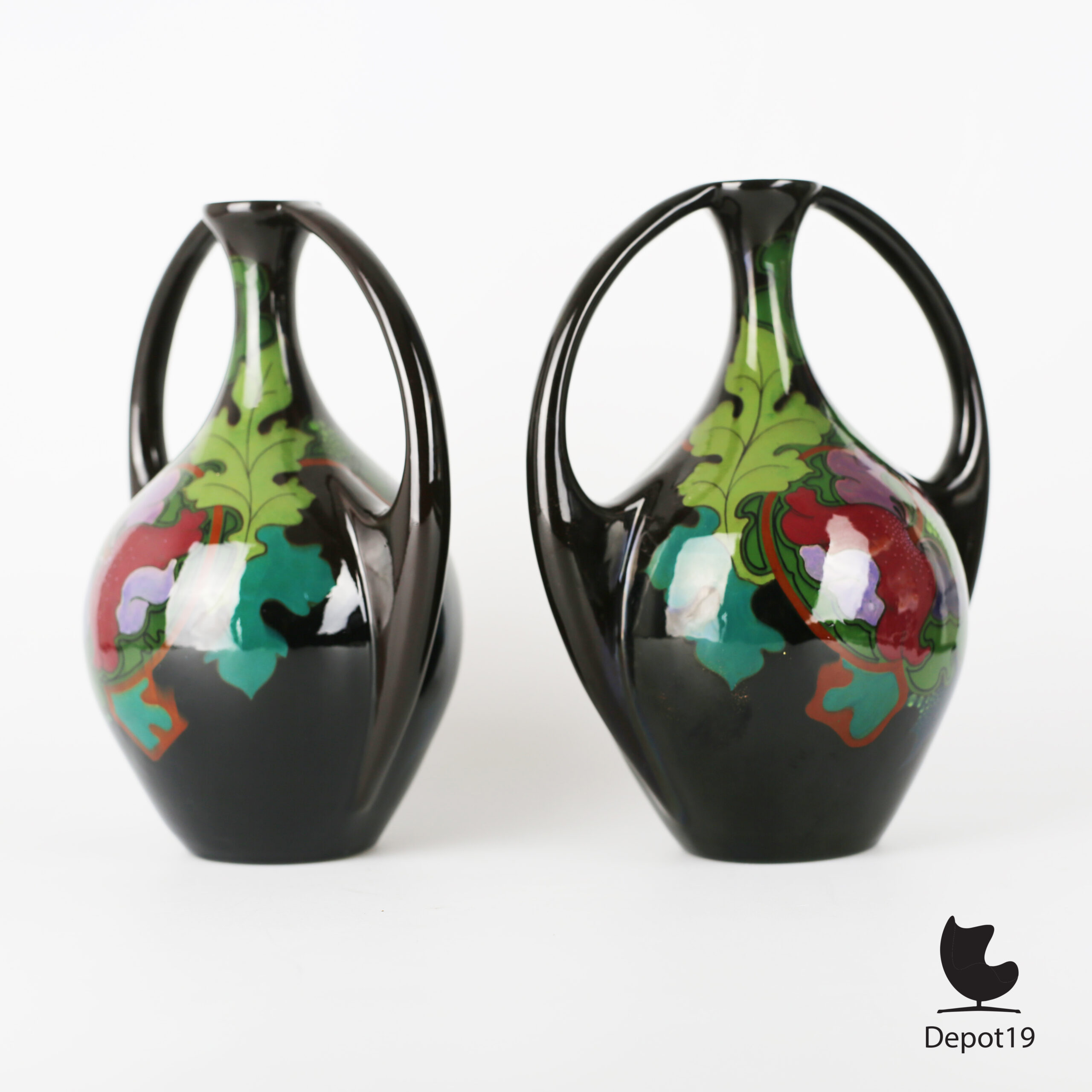 Zeldzame set van twee qua decoratie gespiegelde bij elkaar horende vazen van Plateelbakkerij Regina, Gouda, model 33/3 Uni.