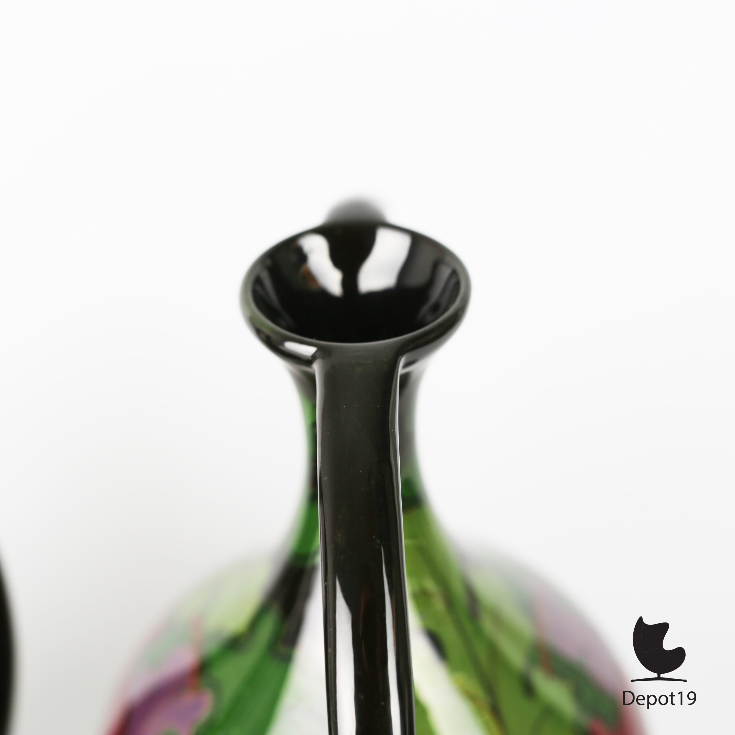 Beide vazen zijn handbeschilderd in meerkleurig glazuur met florale motieven in typische Gouda-stijl.