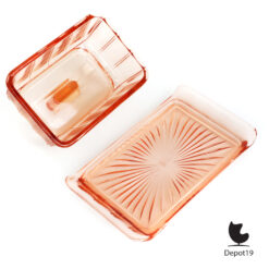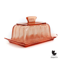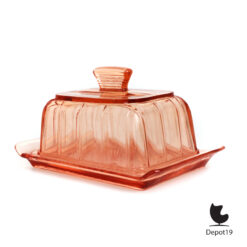 Deze rose Copier kaasstolp, geproduceerd door de Leerdam Glasfabriek in de jaren ’30, is een schitterend voorbeeld van Art Deco design. De stolp is vervaardigd uit hoogwaardig persglas. Deze heeft een zachte roze tint en een gestroomlijnde, bijna architectonische vorm die typerend is voor het werk van Andries Dirk Copier.