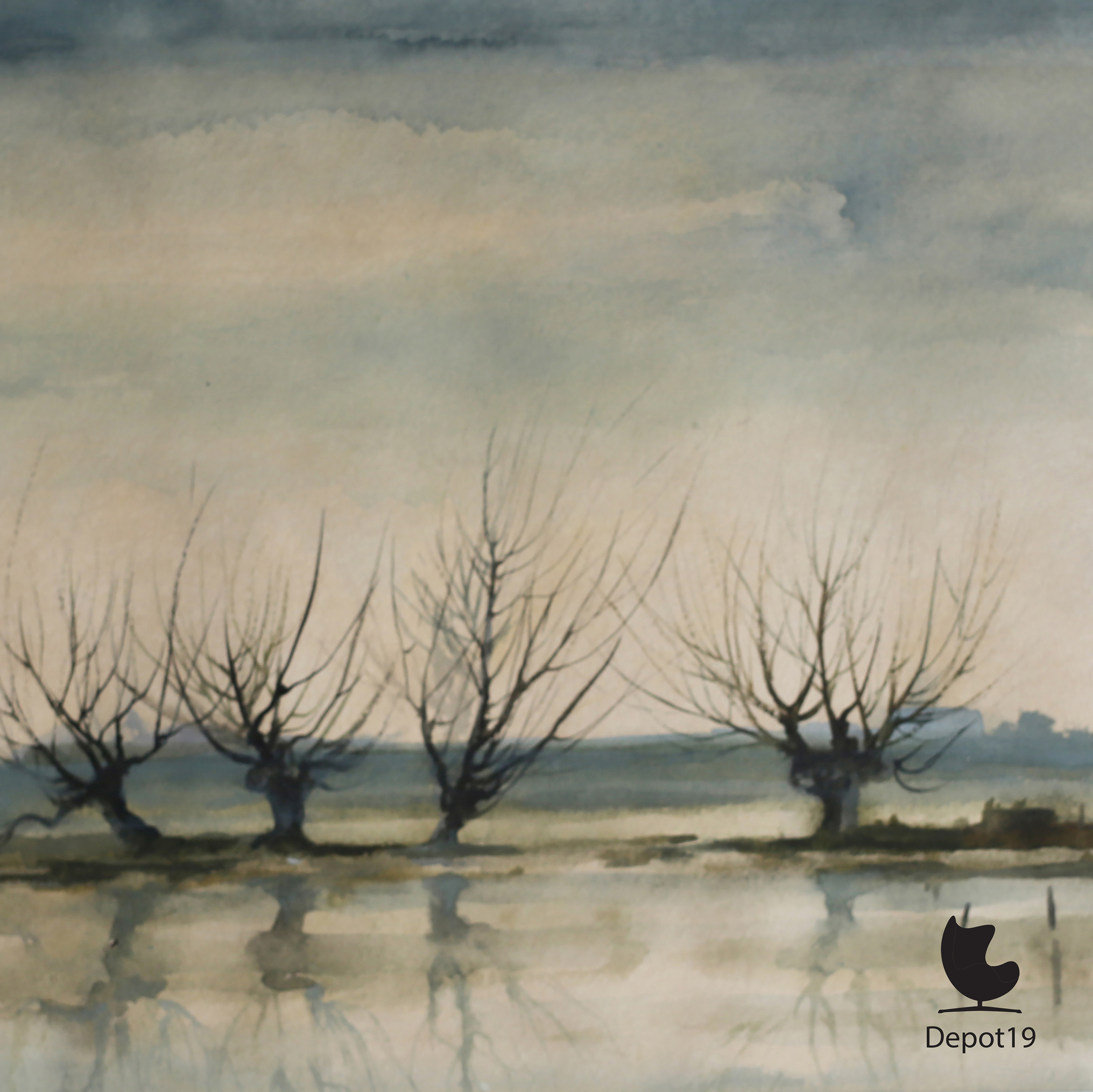 De compositie toont een rij wilgen langs de rivier, weerspiegeld in het kalme water. De zachte overgangen van grijs, blauw en oker geven het winterlandschap een haast tijdloze rust. Door de subtiele lichtval en de reflectie in het water ontstaat een gevoel van oneindige ruimte — een kenmerk dat veel voorkomt in haar werk.