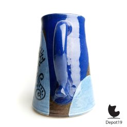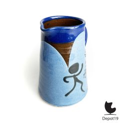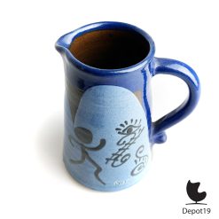 Deze Thomas Buxó kan Picasso stijl blauwe abstracte symbolen komt uit de Spaanse mid-century keramiektraditie en toont een directe verwantschap met Picasso’s vrije lijnvoering en moderne figuratie. De rood keramische basis vormt een krachtig contrast met het expressieve blauw, terwijl de dansende figuren, het mysterieuze oog en ladderachtige symbolen een bijna rituele beeldtaal oproepen. Daardoor ontstaat een artistiek object dat zowel sculpturaal als functioneel overkomt.