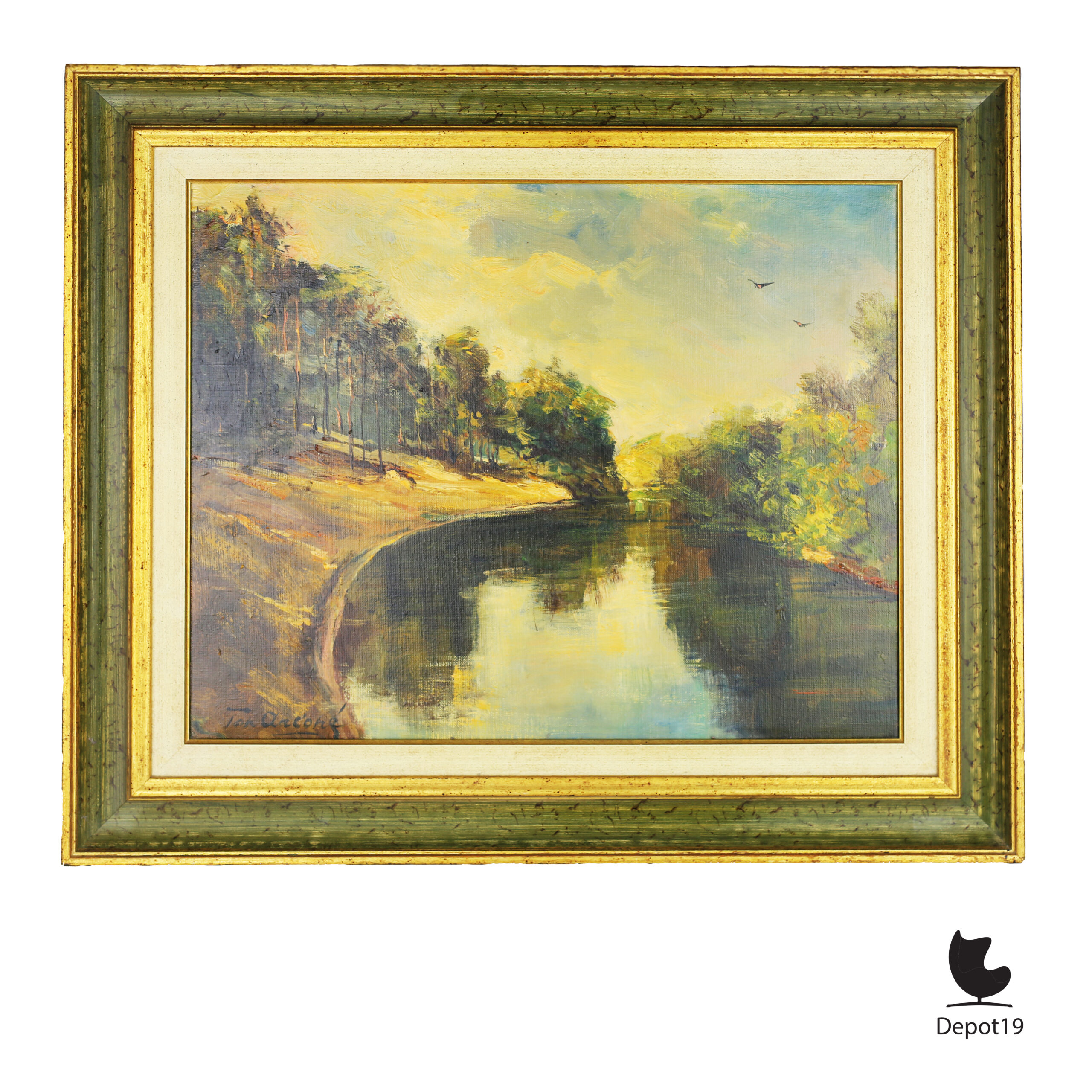 Dit originele olieverfschilderij van Ton Anconé toont een zonnig rivierlandschap waarin licht en kleur samensmelten tot een harmonieuze compositie.