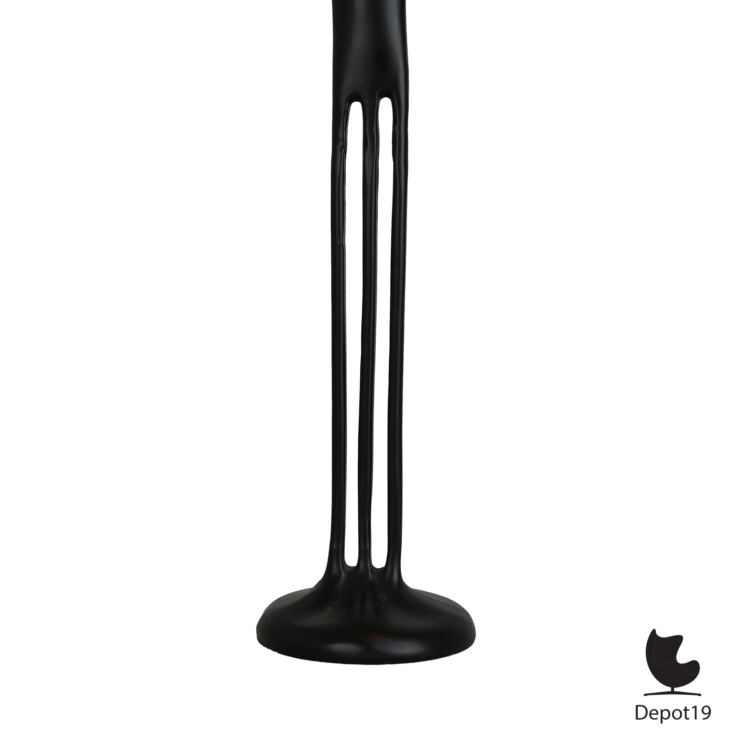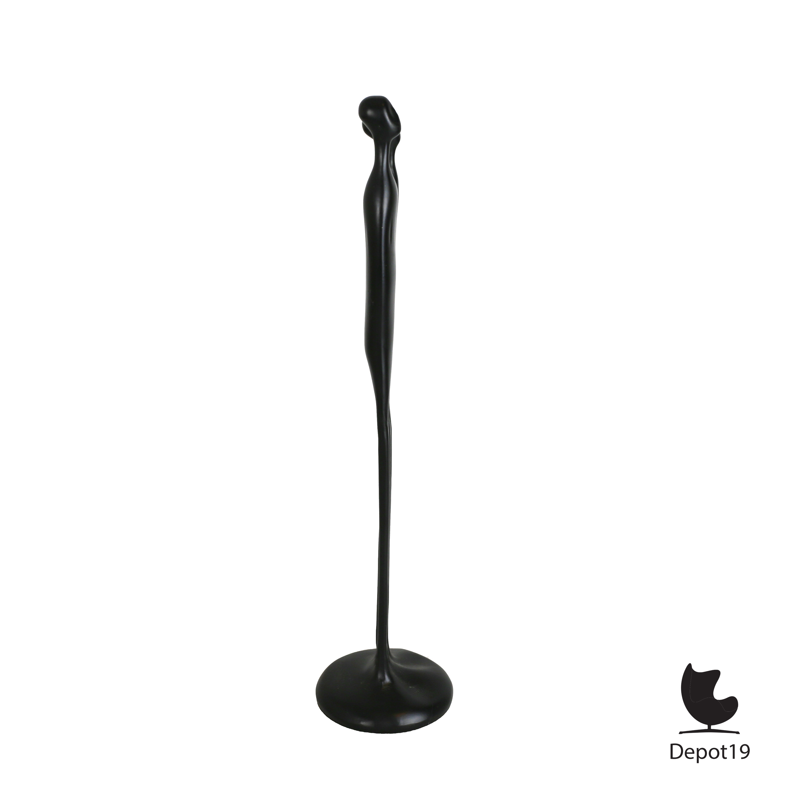 Het beeld is gegoten in gepatineerd brons, waardoor het een diepe, warme kleur krijgt. De donkere patina benadrukt het subtiele lijnenspel en geeft het werk een verfijnde en serene uitstraling. Met een hoogte van 43 cm is de sculptuur groot genoeg om op te vallen, maar blijft zij ingetogen en elegant.