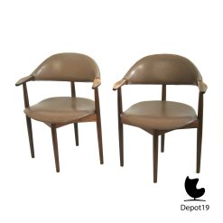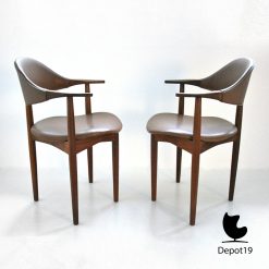 De Cowhorn stoel van Vestervig Eriksen voor Brdr. Tromborg geldt als een icoon van Deens mid-century modern. De stoel onderscheidt zich door de sculpturale hoornvormige rugleuning die onmiddellijk opvalt door haar vloeiende lijnen en verfijnde balans. Massief palissander geeft het frame een diepe glans en een warme kleurtoon die prachtig contrasteert met het leverkleurige kunstleer. Deze combinatie levert een ontwerp op dat tegelijk elegant, comfortabel en bijzonder tijdloos blijft.