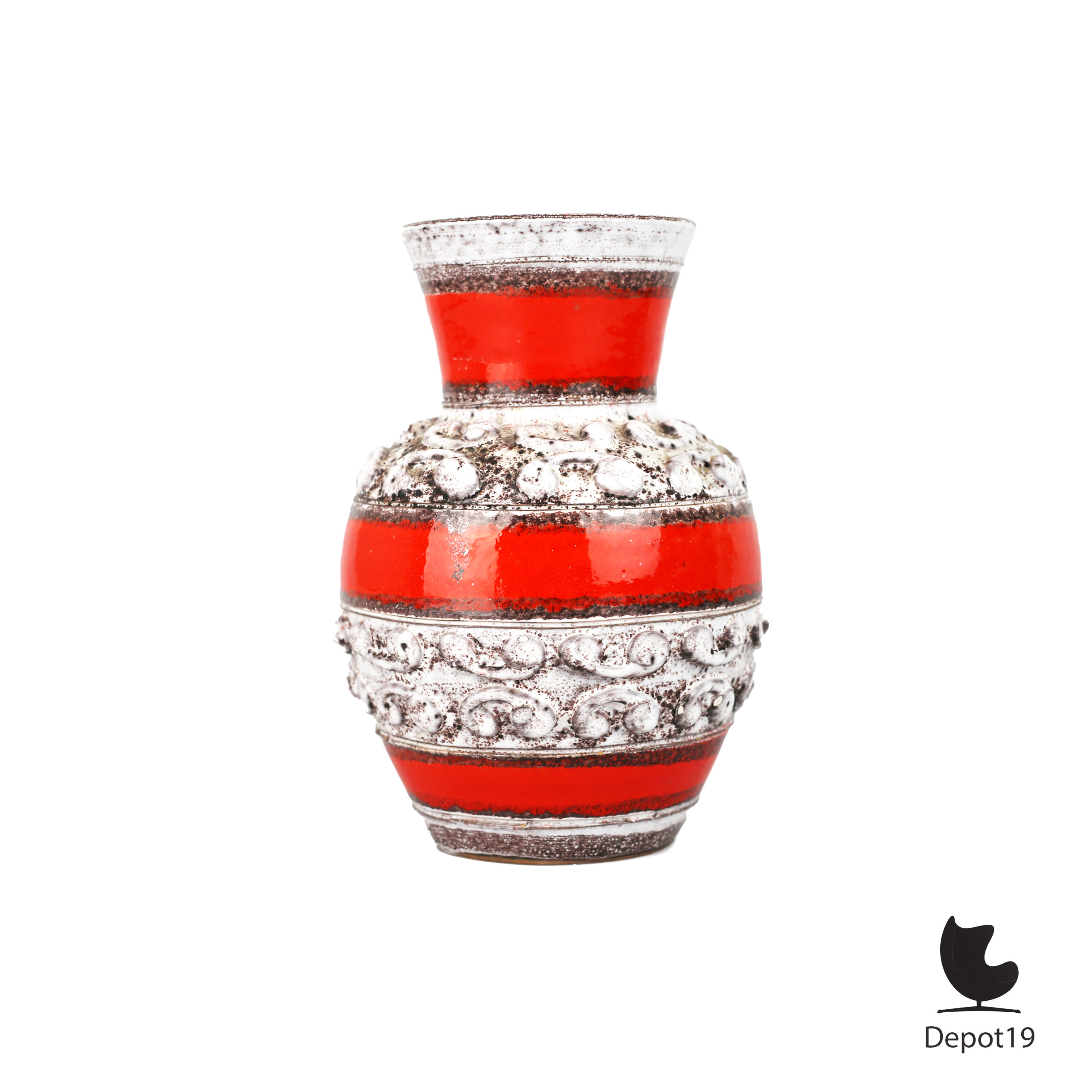 De witte reliëfband met luchtbelstructuur is een schoolvoorbeeld van het Fat Lava-glazuur. In combinatie met de roodbruine klei onderscheidt deze vaas zich van andere keramiek uit die tijd, zoals de fijnere, lichtere klei van Italiaanse ateliers als Nuovo Rinascimento. Elke Fat Lava vaas is handgemaakt en uniek – geen twee zijn exact gelijk.