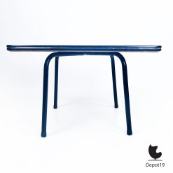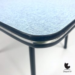 Dit blauw formica tafeltje 1950s toont perfect hoe kleur, materiaal en vorm samenkomen in naoorlogs design. Het diepe blauw contrasteert mooi met de zwarte poten, waardoor het tafeltje meteen de aandacht trekt. De randafwerking met kantenband geeft een uitgesproken vintage karakter dat je direct aan de jaren vijftig doet denken.