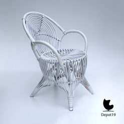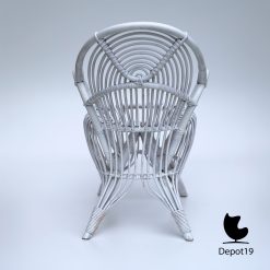Dit exemplaar heeft een witte afwerking die het natuurlijke rotan verfijnt en een frisse uitstraling geeft in hedendaagse interieurs. De vloeiende rondingen passen perfect bij Albini’s minimalistische Italiaanse stijl, waarin functionaliteit en elegantie elkaar versterken. De hoogte bedraagt ongeveer 80 cm, terwijl de zithoogte rond 43 cm ligt. Daardoor zit de stoel comfortabel én oogt hij ruimtelijk in de kamer.