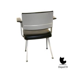 Het ontwerp bestaat uit een robuust stalen frame met geïntegreerde armleuningen, waardoor de stoel comfortabeler aanvoelt dan klassieke werkstoelen uit dezelfde periode. De zwarte kunstlederen bekleding versterkt de industriële uitstraling en sluit mooi aan bij modernistische interieurs waarin eenvoud en materiaalexpressie belangrijk zijn. De stoel verkeert in een goede vintage staat, met natuurlijke sporen die het karakter versterken.