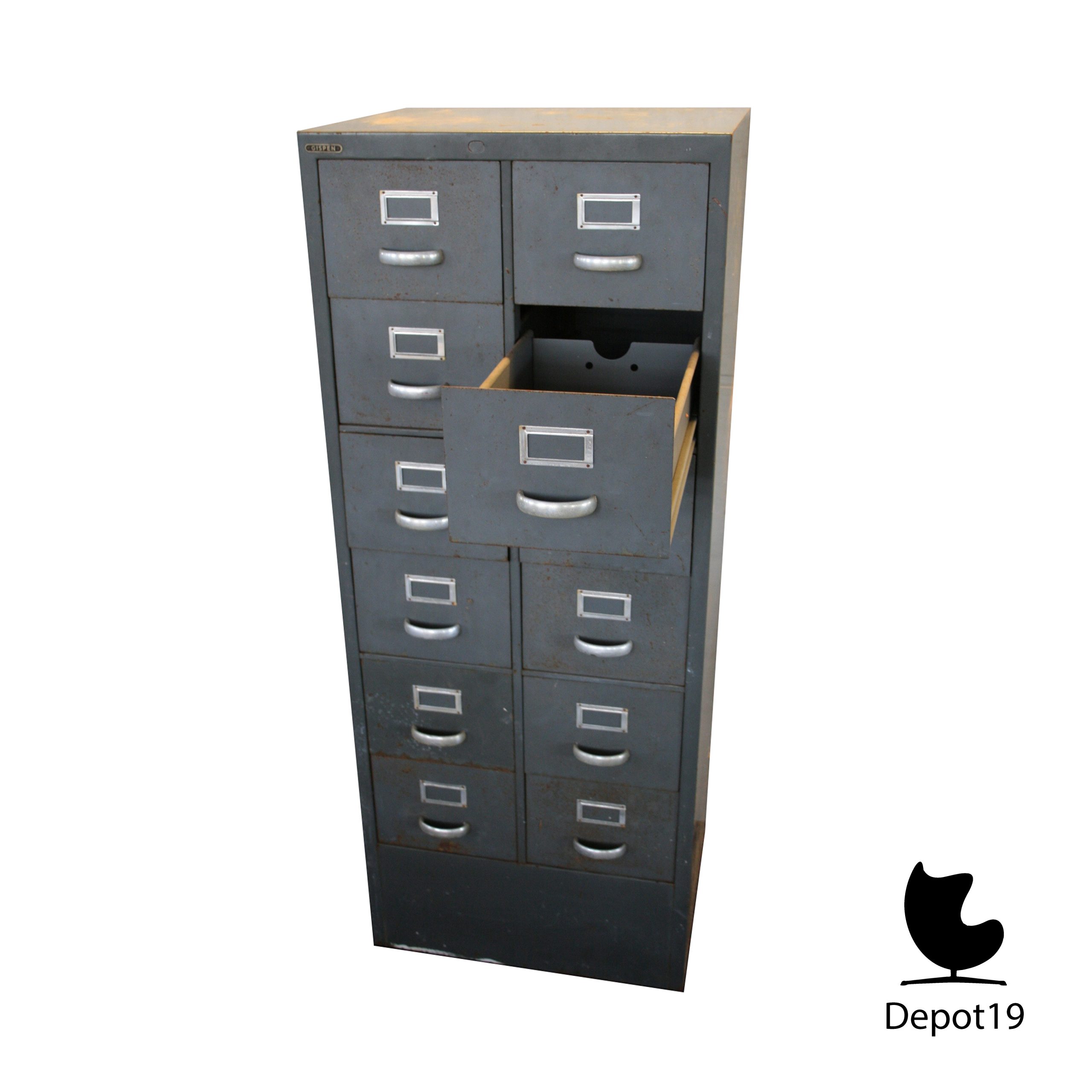 Het meubel biedt een royale opbergcapaciteit dankzij de twaalf gelijkvormige lades, die soepel open en dicht gaan. De kast bezit nog steeds de originele laklagen, die lichte sporen van leeftijd kunnen tonen en zo bijdragen aan het authentieke karakter. De combinatie van vakmanschap, materiaalgebruik en functionele helderheid maakt dit model tot een waardevol stuk binnen het Nederlandse naoorlogse industriële design.