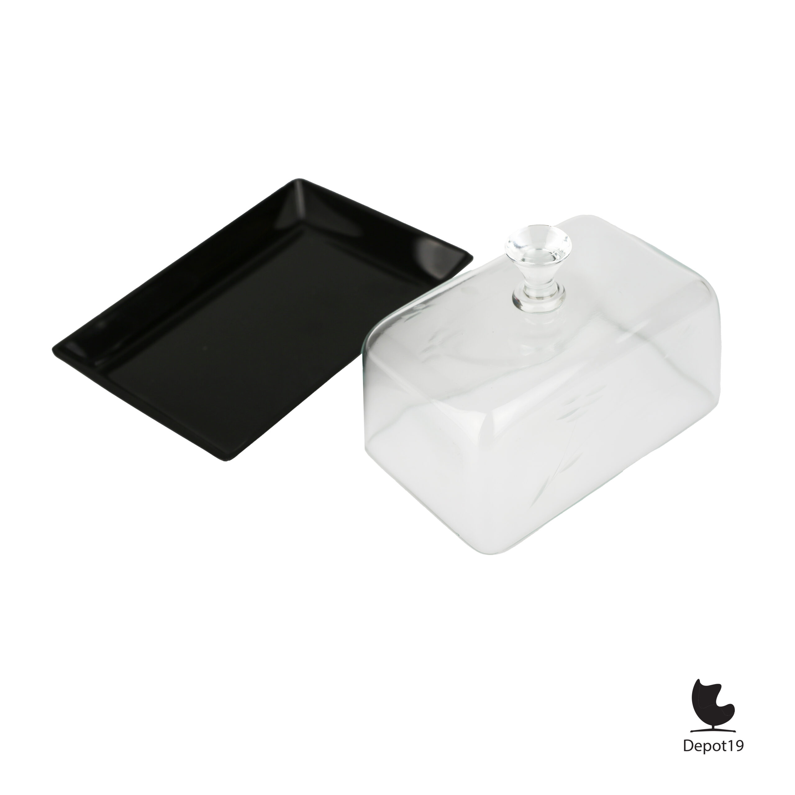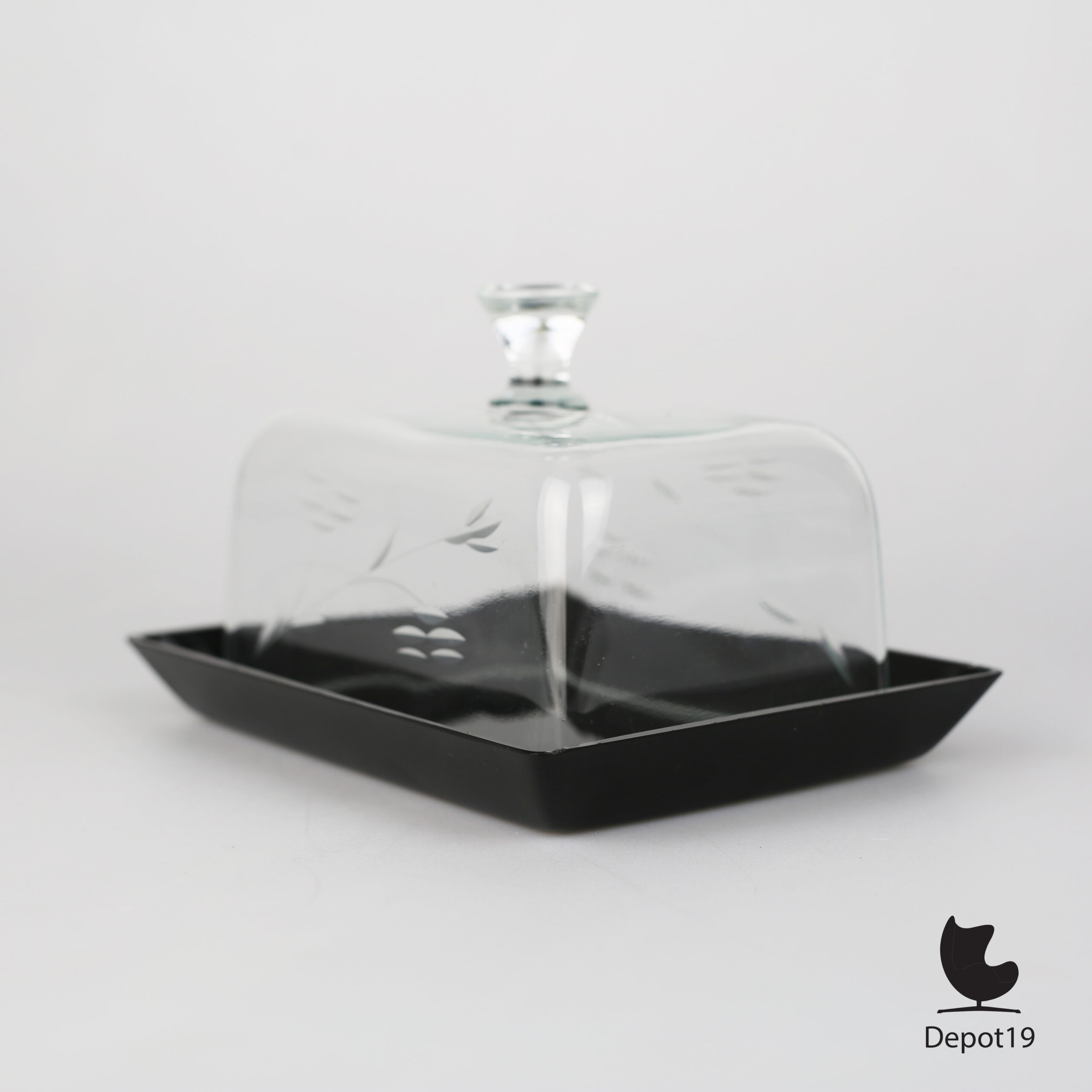 Elegante glazen kaasstolp met handgegraveerd bloem- en bladmotief op de kap en een zeldzame zwarte glazen bodem.
