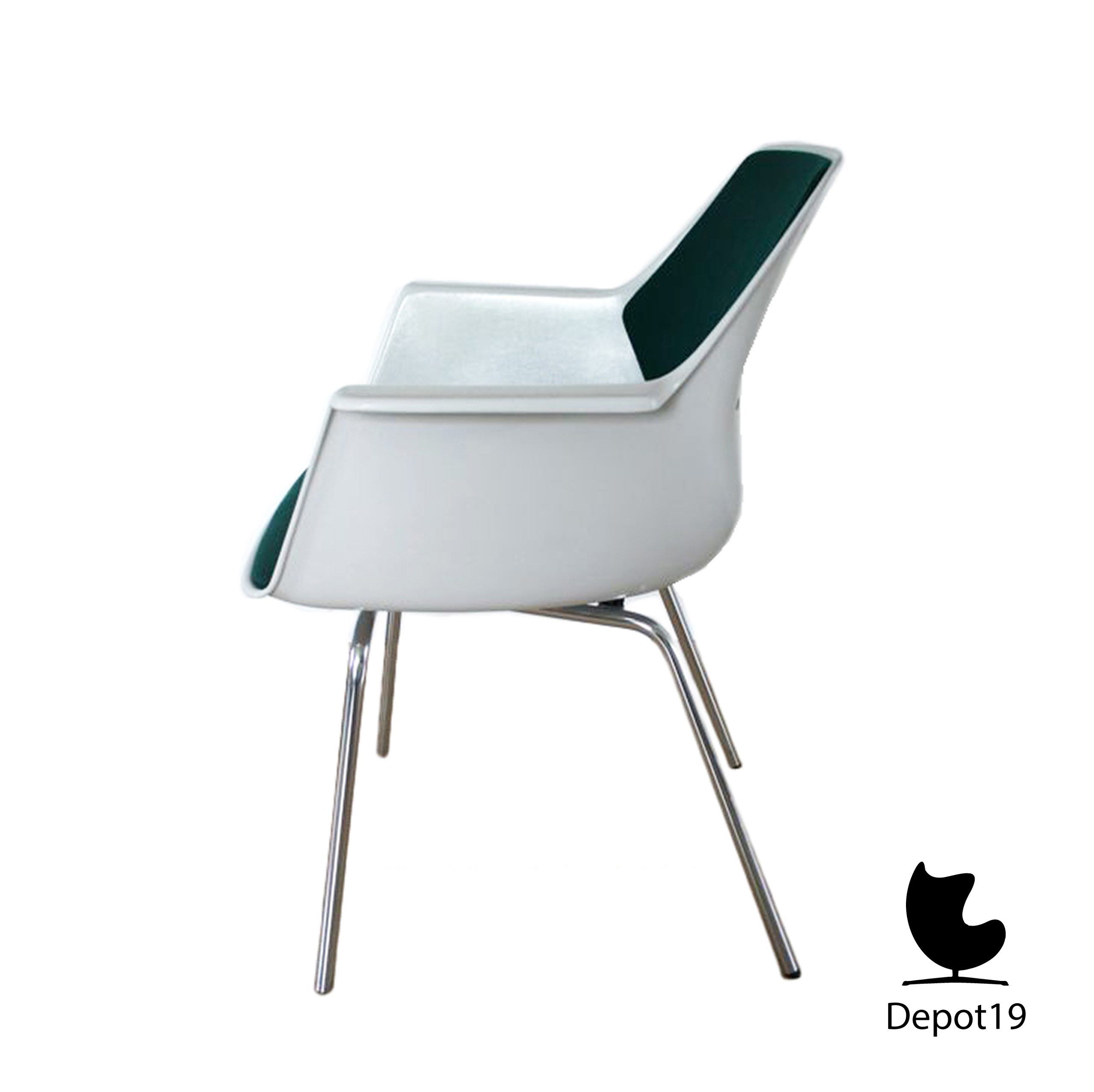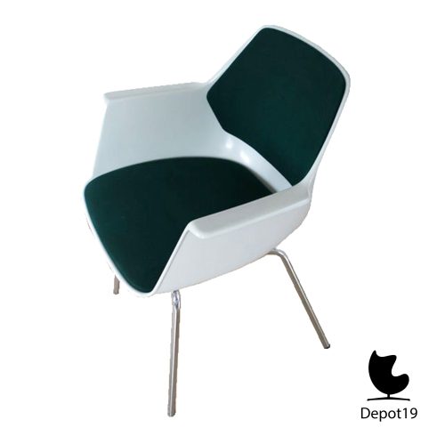 Leowald werkte in de jaren 60 nauw samen met Wilkhahn en liet zich inspireren door de internationale Mid-Century beweging, waarbij functionaliteit, eenvoud en experiment met nieuwe materialen centraal stonden. Deze stoel toont die gedachtegang in zijn pure vorm. De kuip heeft een helder silhouet dat doet denken aan de Eames-esthetiek, maar de uitvoering sluit duidelijk aan bij Leowalds Duitse precisie en zijn streven naar duurzame, toekomstgerichte meubelconstructies.
