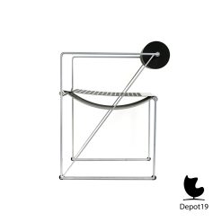 Het ontwerp toont een duidelijke architectonische logica. De stoel bestaat uit een zwart gelakt stalen frame met een zitting van geperforeerd staal. De rugleuning wordt gevormd door twee cilindrische kussens van zwart polyurethaan, die een opvallend visueel en tactiel contrast creëren met de strakke metalen structuur. Deze speelse spanning tussen hard en zacht, tussen orde en comfort, maakt de stoel tot een ware designklassieker.