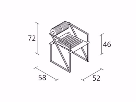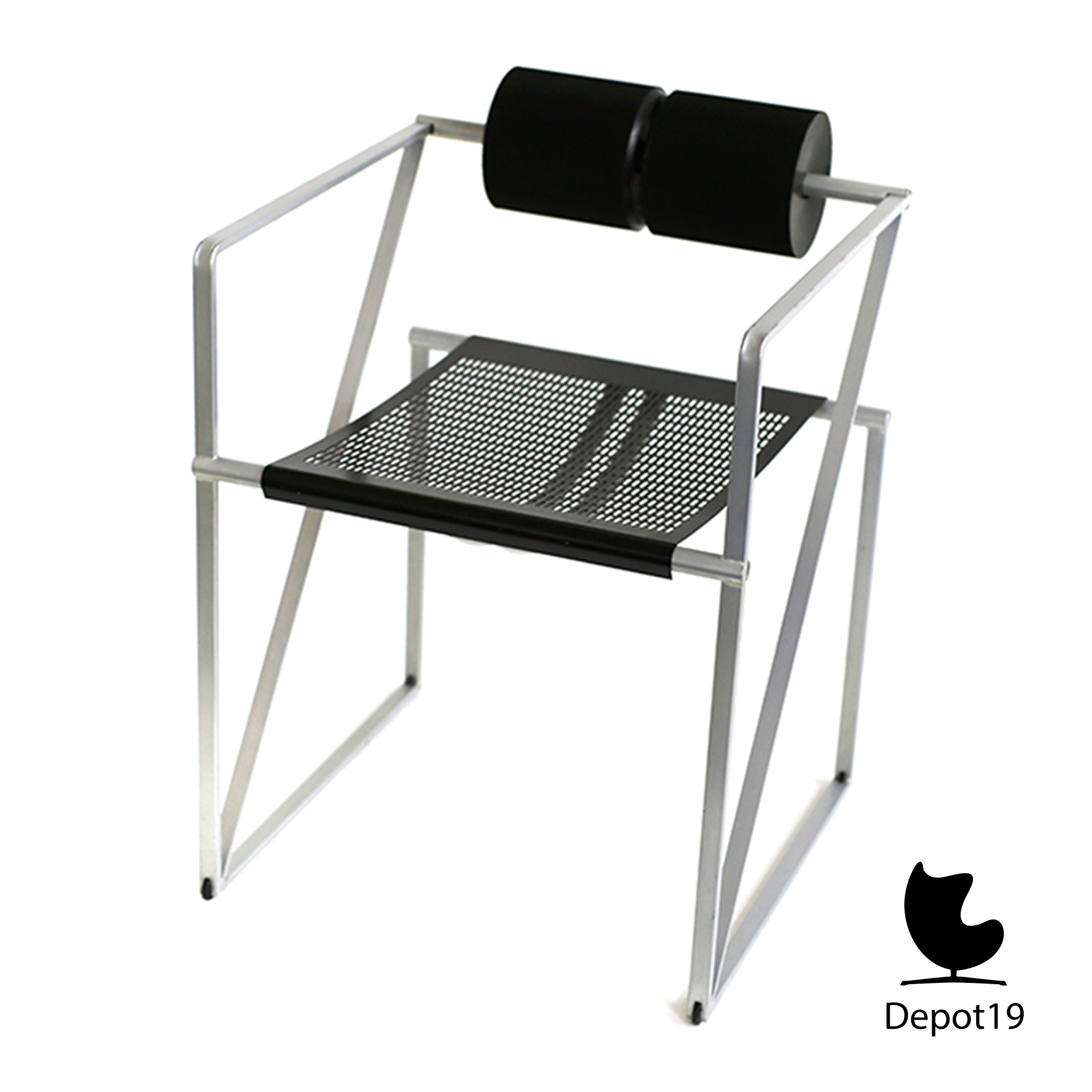Het ontwerp toont een duidelijke architectonische logica. De stoel bestaat uit een zwart gelakt stalen frame met een zitting van geperforeerd staal. De rugleuning wordt gevormd door twee cilindrische kussens van zwart polyurethaan, die een opvallend visueel en tactiel contrast creëren met de strakke metalen structuur. Deze speelse spanning tussen hard en zacht, tussen orde en comfort, maakt de stoel tot een ware designklassieker.