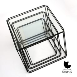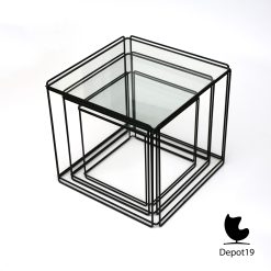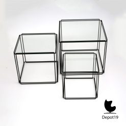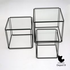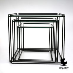 De Max Sauze Isocele Mimiset, ontworpen in de jaren zeventig voor Max Sauze Studio. De set bestaat uit drie bijzettafels met een zwarte stalen structuur en glazen bladen, die afzonderlijk of als ensemble te gebruiken zijn.