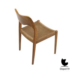 De Model 71 is een van zijn meest geliefde ontwerpen. De stoel combineert een massief teakhouten frame met een zitting van handgevlochten papercord, wat zorgt voor een natuurlijke balans tussen stevigheid en verfijning. De zachte ronding van de rugleuning en de vloeiende lijn van het frame geven de stoel een lichtheid die typisch is voor Møllers stijl. Elk exemplaar werd met de hand vervaardigd, waardoor geen twee stoelen exact gelijk zijn — een weerspiegeling van echt ambachtelijk Deens design.