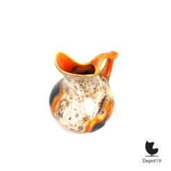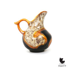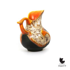 Model 845 is uitgevoerd in een zachte, organische vorm met een subtiele kleurverlooptextuur, typerend voor de spuitglazuurtechniek die het aardewerk een unieke diepte en warme, bijna wolkachtige schakering geeft. De kan verenigt eenvoud met artistiek vakmanschap, ontstaan in een tijd waarin functionaliteit en esthetiek tijdens de crisisjaren nauw verweven waren.