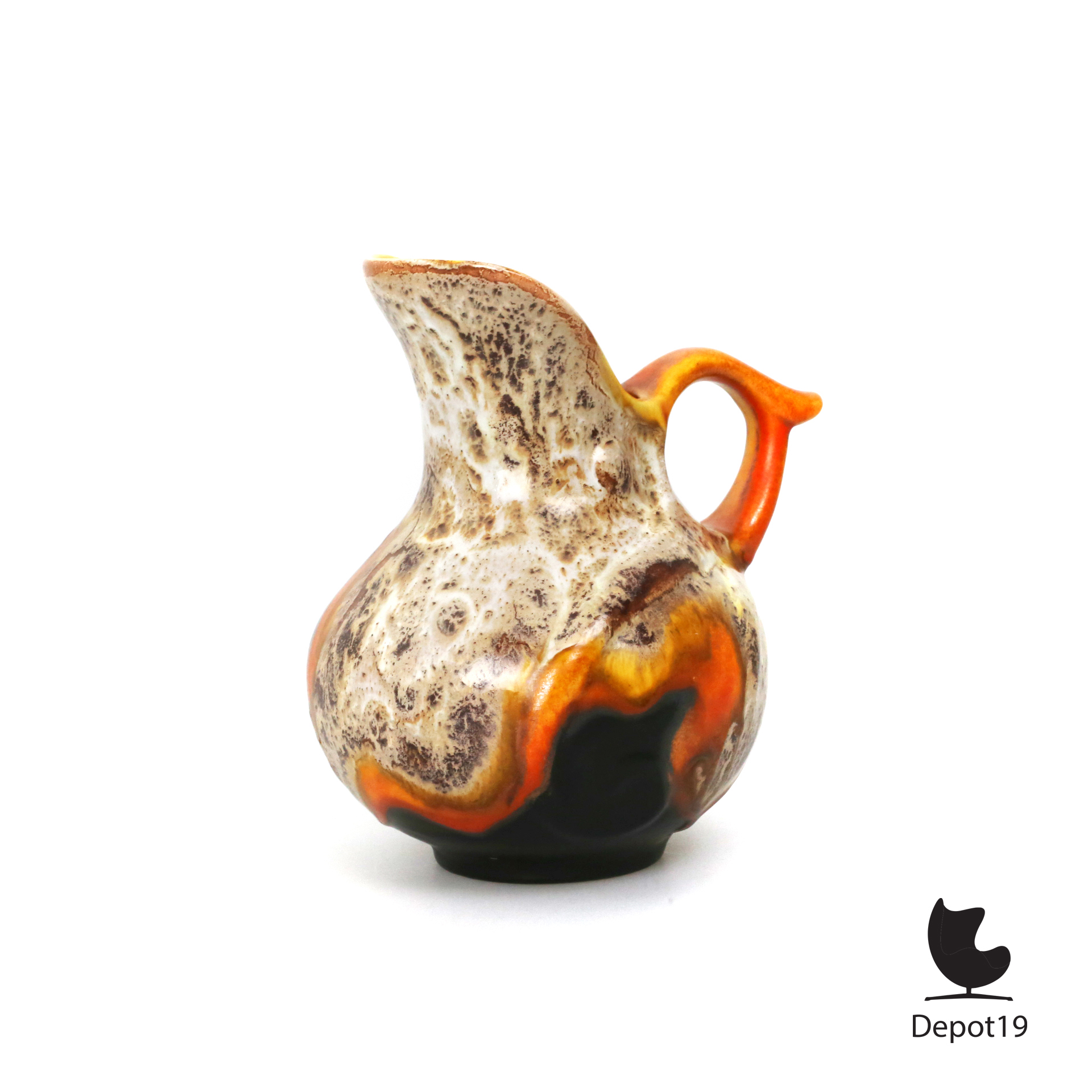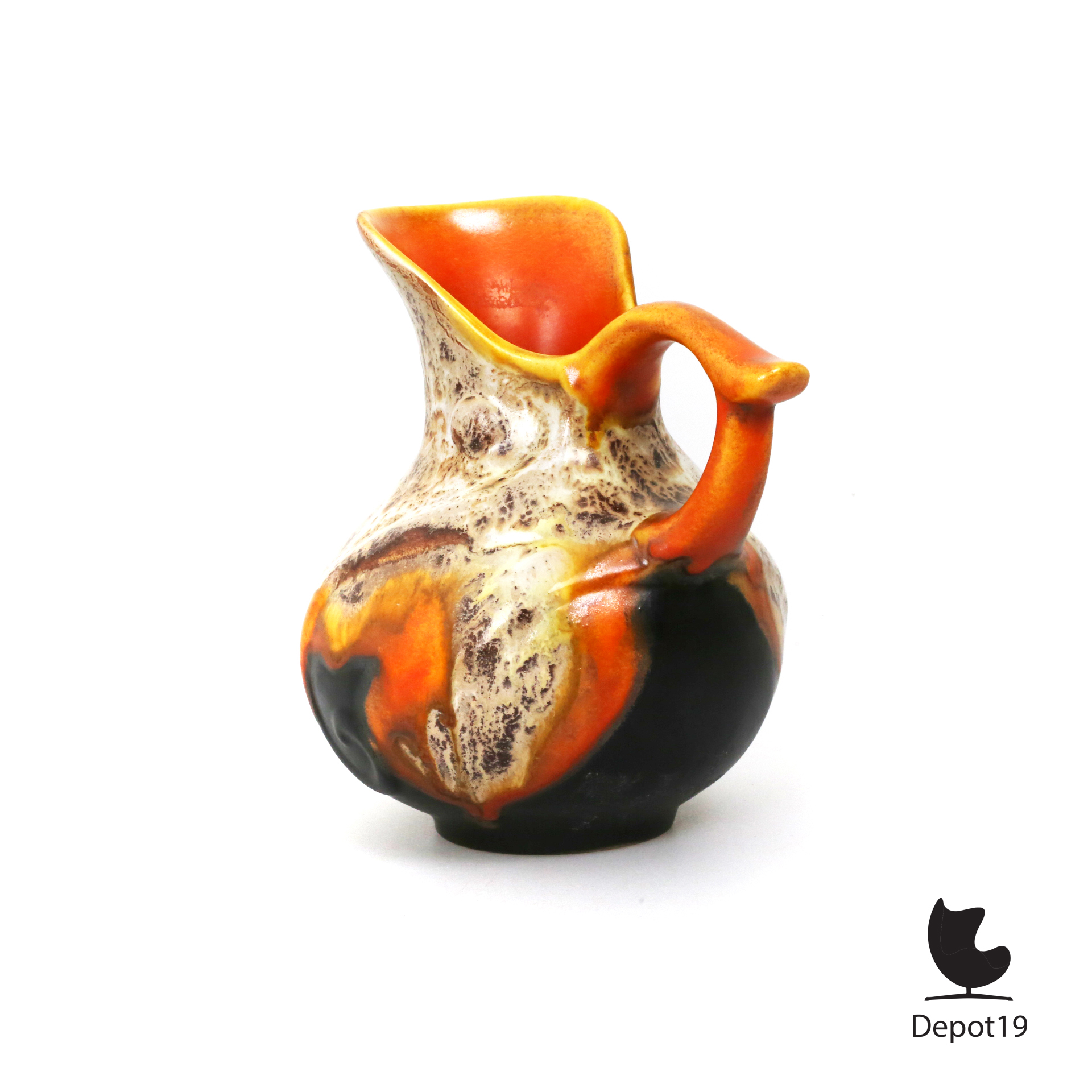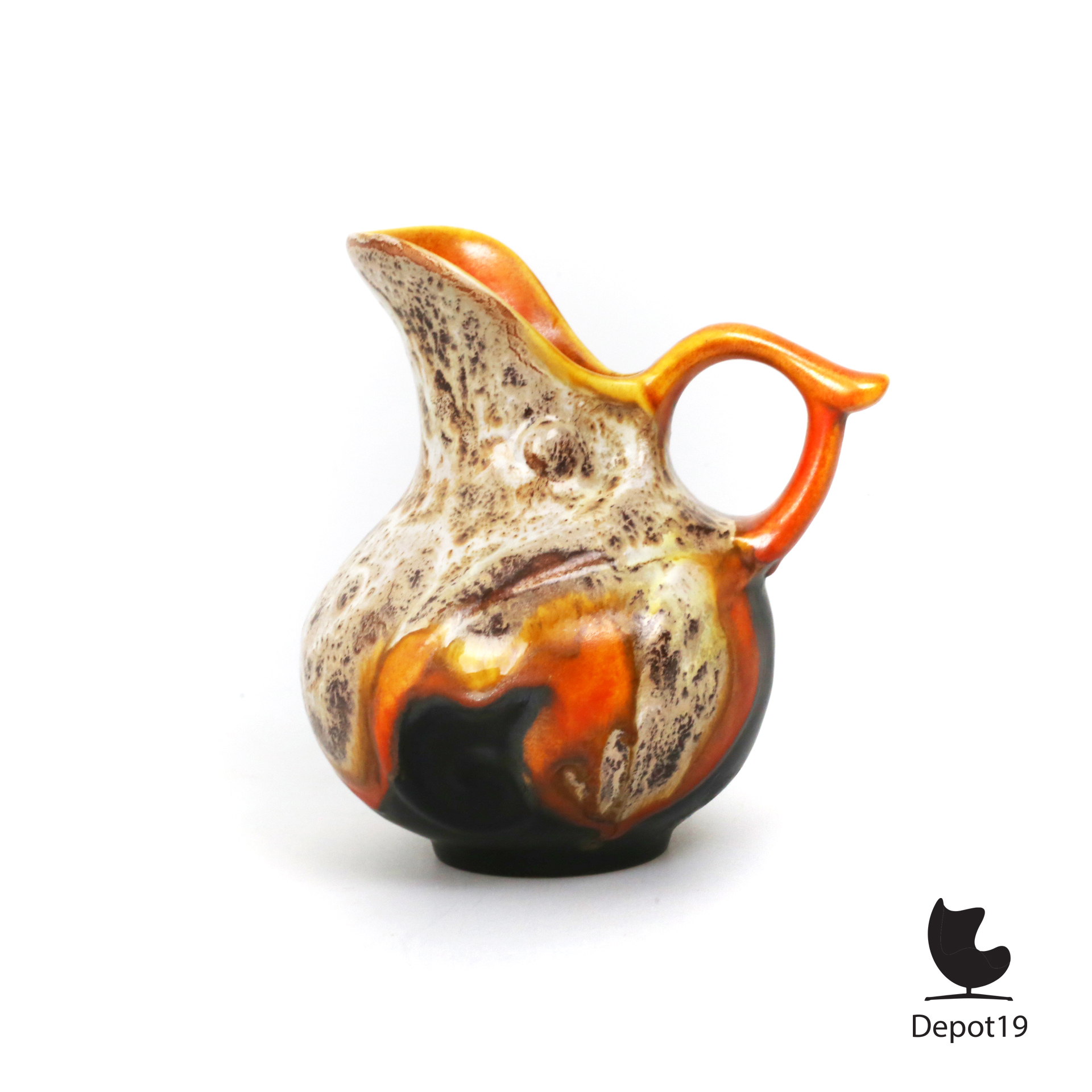 Model 845 is uitgevoerd in een zachte, organische vorm met een subtiele kleurverlooptextuur, typerend voor de spuitglazuurtechniek die het aardewerk een unieke diepte en warme, bijna wolkachtige schakering geeft. De kan verenigt eenvoud met artistiek vakmanschap, ontstaan in een tijd waarin functionaliteit en esthetiek tijdens de crisisjaren nauw verweven waren.