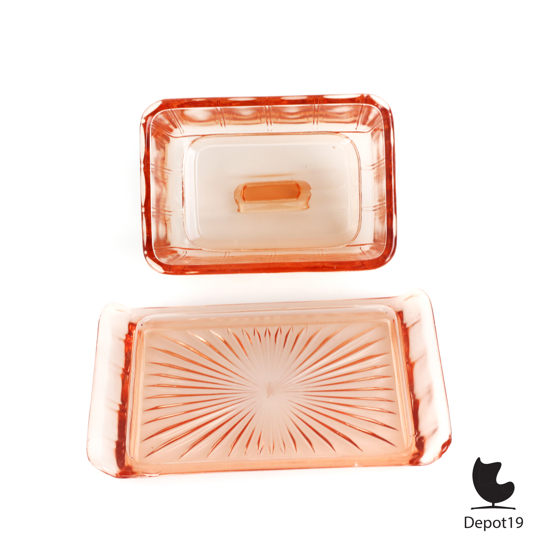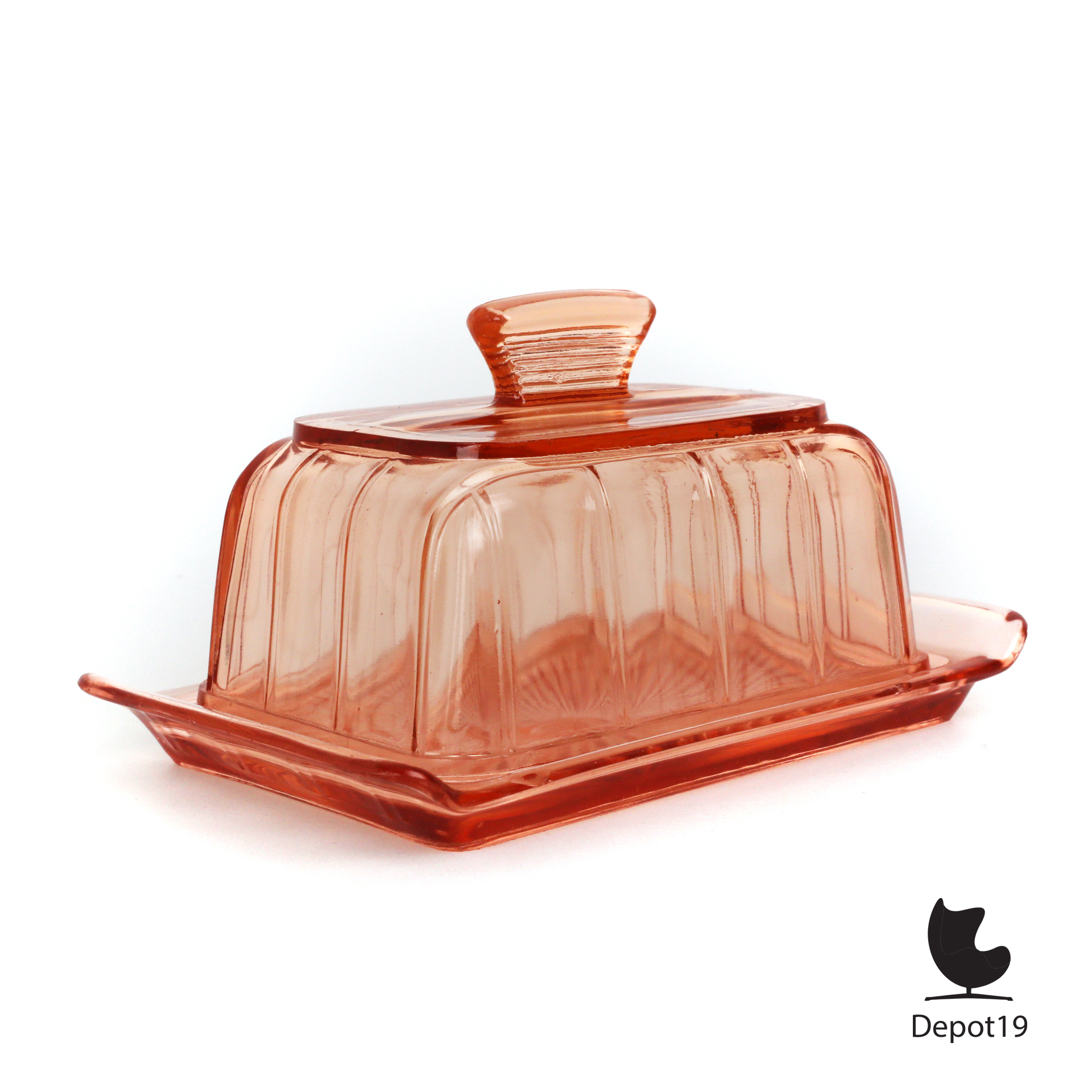 Deze rose Copier kaasstolp, geproduceerd door de Leerdam Glasfabriek in de jaren ’30, is een schitterend voorbeeld van Art Deco design. De stolp is vervaardigd uit hoogwaardig persglas. Deze heeft een zachte roze tint en een gestroomlijnde, bijna architectonische vorm die typerend is voor het werk van Andries Dirk Copier.