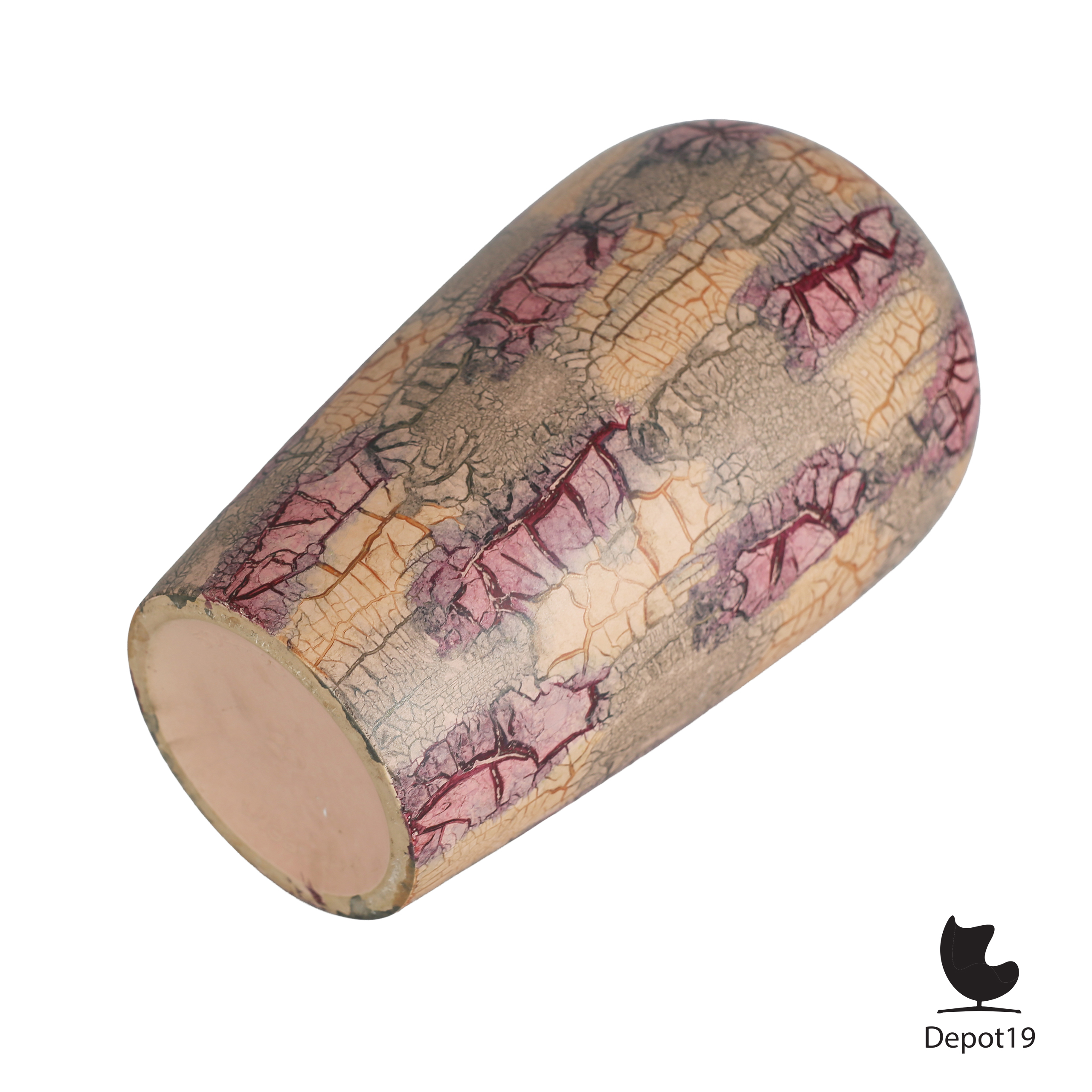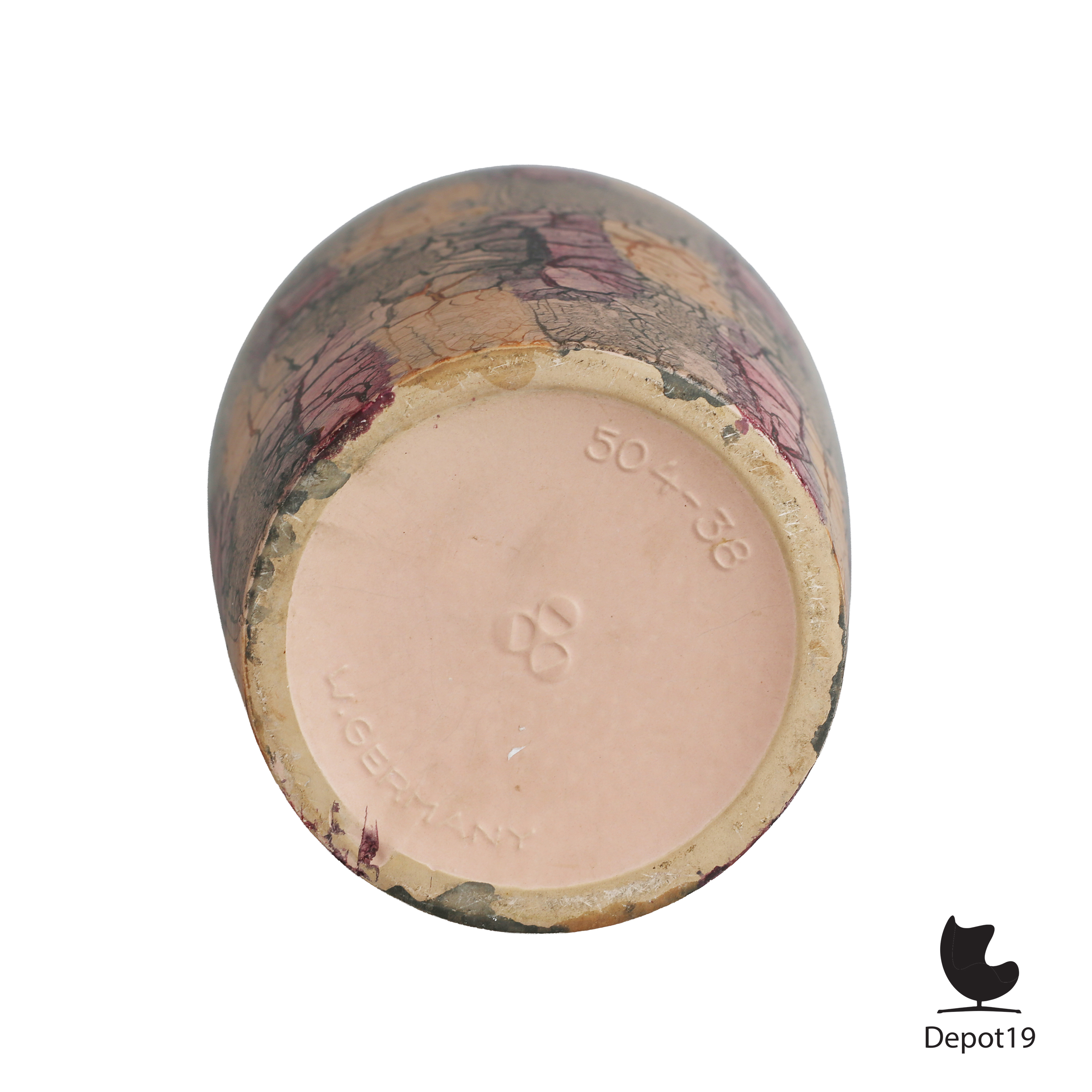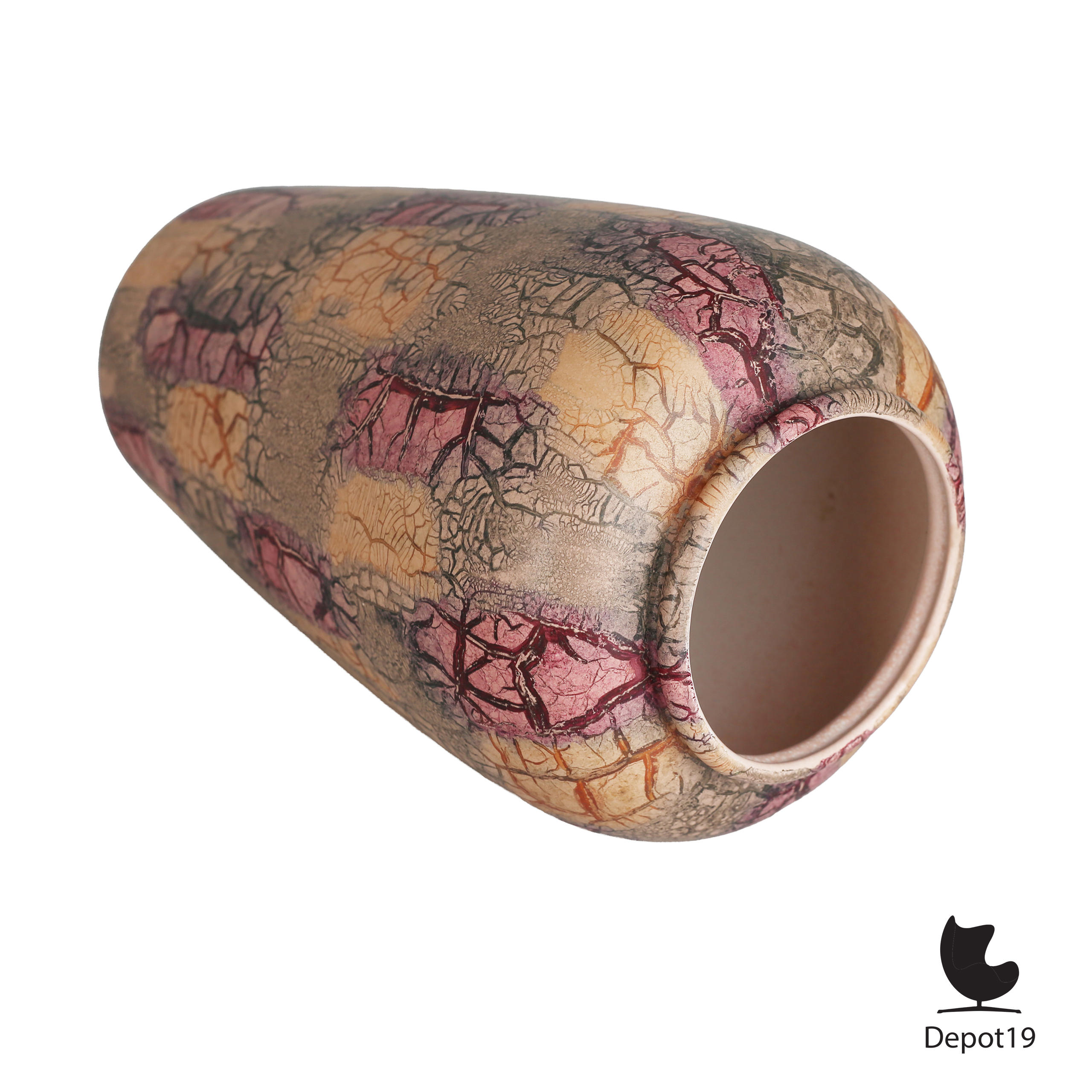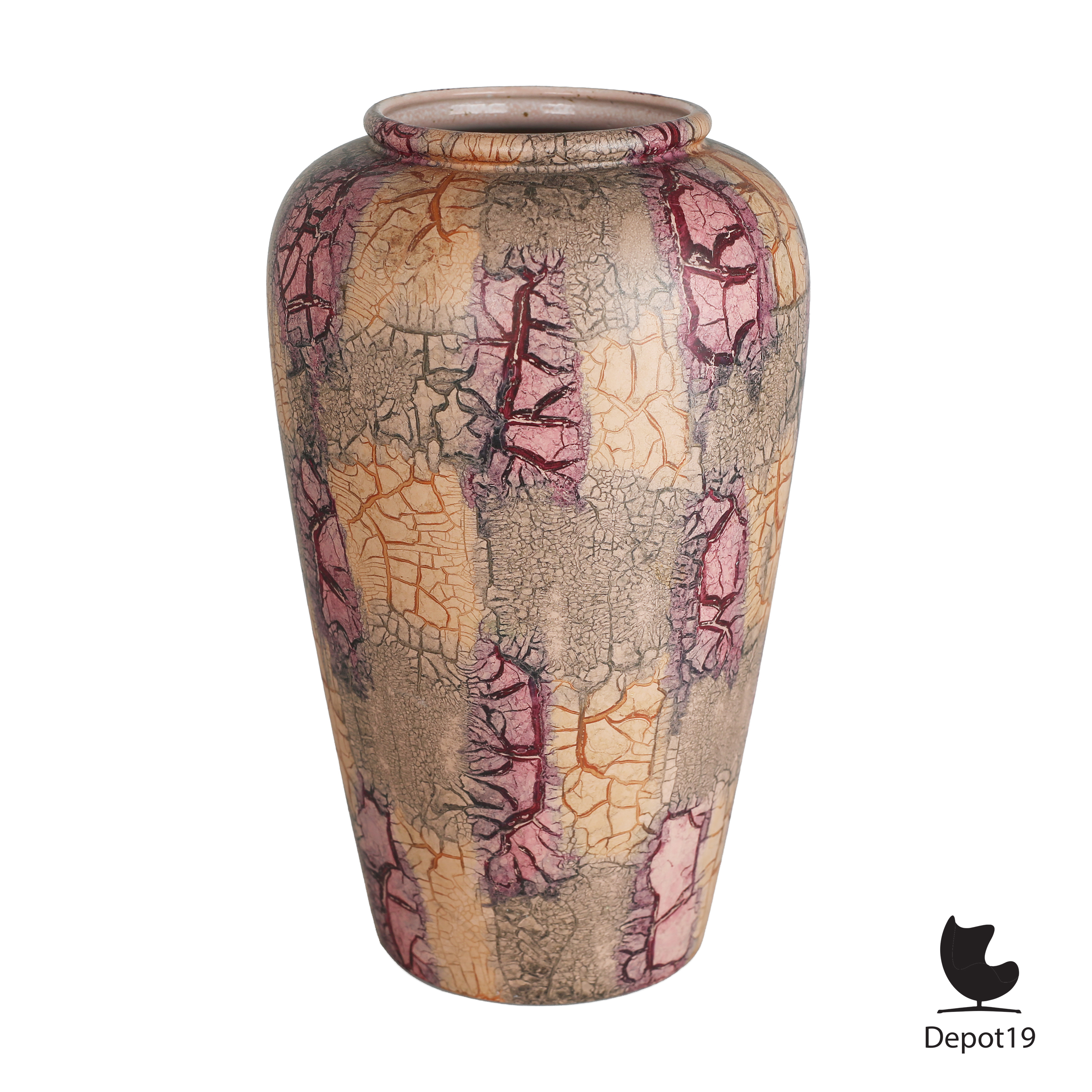 Deze grote Scheurich 504-38 vaas toont het typische craquelé-decor dat eind jaren zestig populair werd binnen de West-Germany keramiek. Het oppervlak bestaat uit diep gebarsten lijnen die met de hand zijn ingekleurd in tinten paars, rood, oranje en beige. Hierdoor ontstaat een krachtig patroon dat zowel textuur als warmte toevoegt aan het ontwerp.