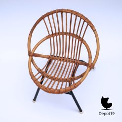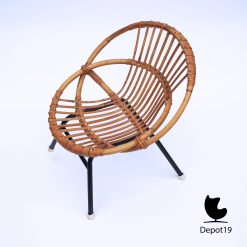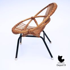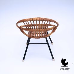 Bovendien combineert de stoel natuurlijk rotan met een slank metalen frame. Daardoor blijft het object visueel licht, terwijl de constructie verrassend stevig aanvoelt. Het ontwerp toont helder hoe Van Sliedregt functionaliteit en natuurlijke materialen esthetisch samenbracht tijdens de jaren vijftig.