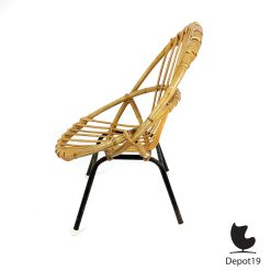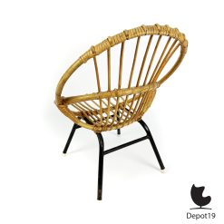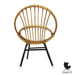 De kinderstoel ontworpen door Dirk van Sliedregt in 1956 voor Rohe Noordwolde kenmerkt zich door het zwart metalen frame en het gebruik van rotan.