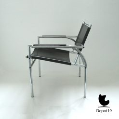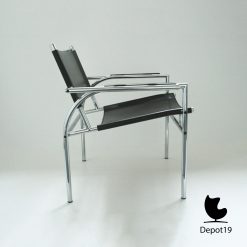 Chromen Leolux Fauteuil in zwart tuigleer. Deze lounge stoel van Gerard Vollenbrock is ontworpen in de jaren 80. De stoel verkeert in een goede vintage staat. De vormentaal van deze stoel lijkt op de 4735 fauteuil voor Gelderland en de First design stoel, ook een ontwerp van Gerard Vollenbrock. Vollenbrock is meubelontwerper sinds 1981, maar ook schilder en schrijver. Zijn meubelontwerpen zijn nuchter en vakkundig gemaakt en herkenbaar aan hun eenvoud.